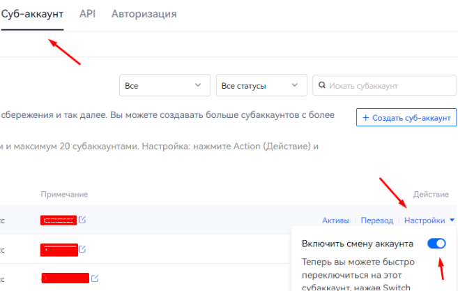 3. В меню “Суб-аккаунт” - жмем “Настройки”, затем “Включить смену аккаунтов”, это даст нам возможность быстро переключаться между нашими аккаунтами по нажатию кнопки “Сменить аккаунт” и создавать новые адреса: