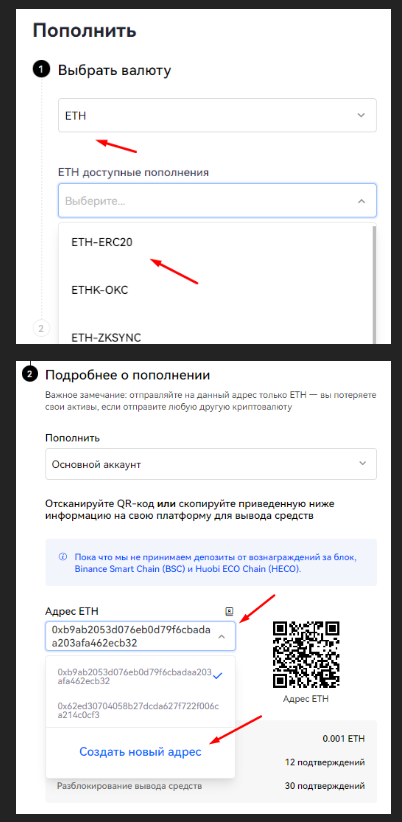 2. Затем, выбирает монету для пополнения, а потом создаем адреса: