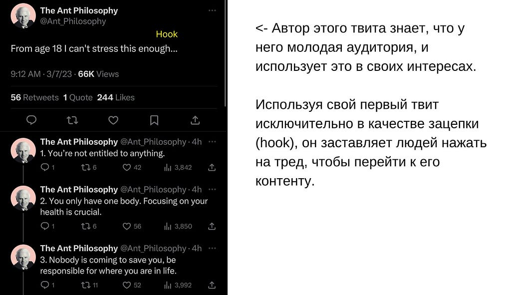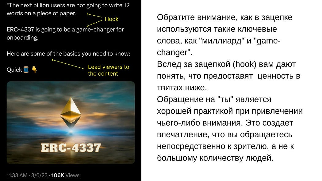 The main part of your content is the place where the main information value for the audience is located. If you do well with this part, you will begin to gain the confidence of the audience, which will increase the likelihood that they will interact with your tweet and/or subscribe to you.