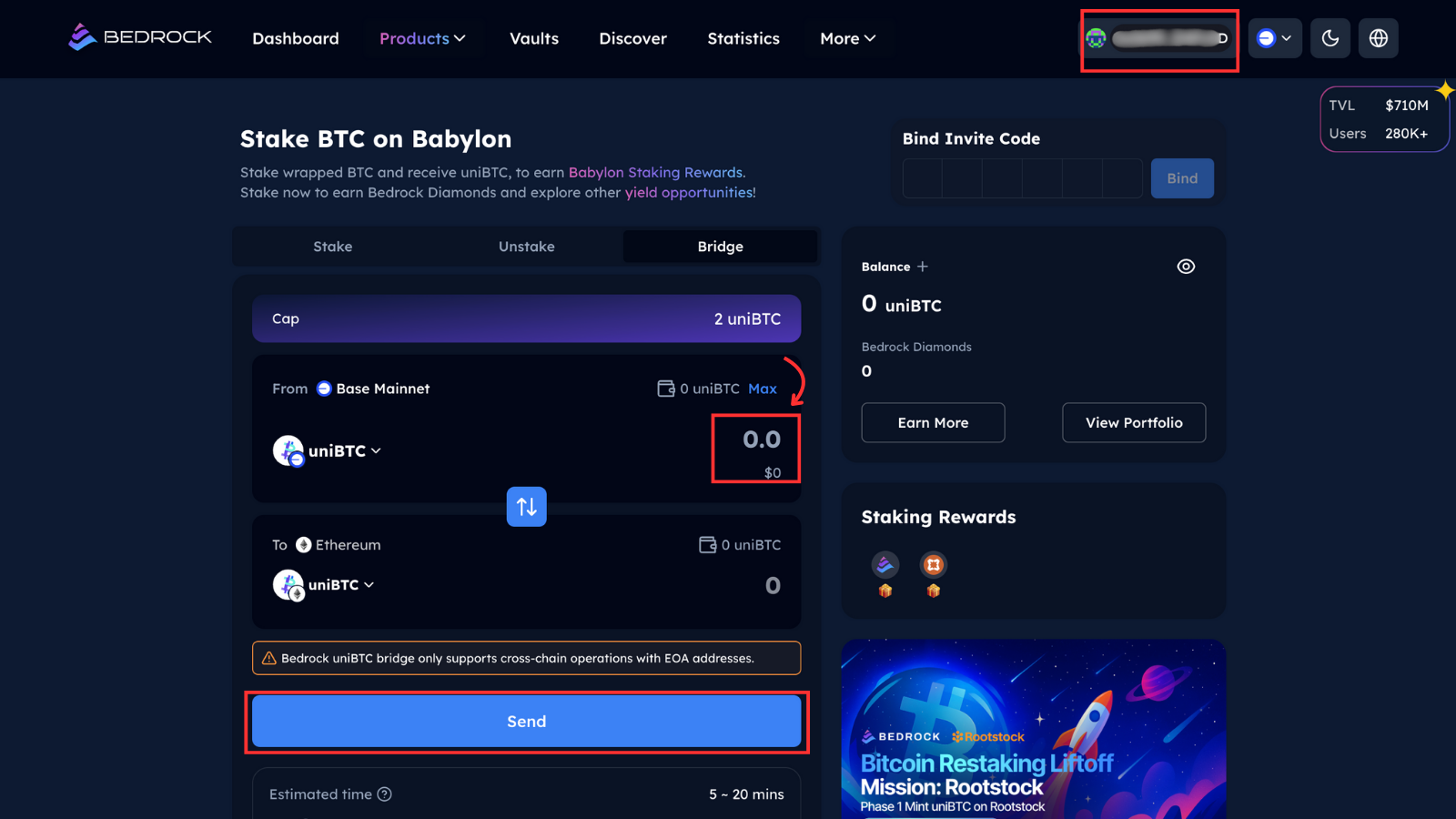 Visit Bedrock’s dApp and connect your Web3 wallet where you store your uniBTC on Base.