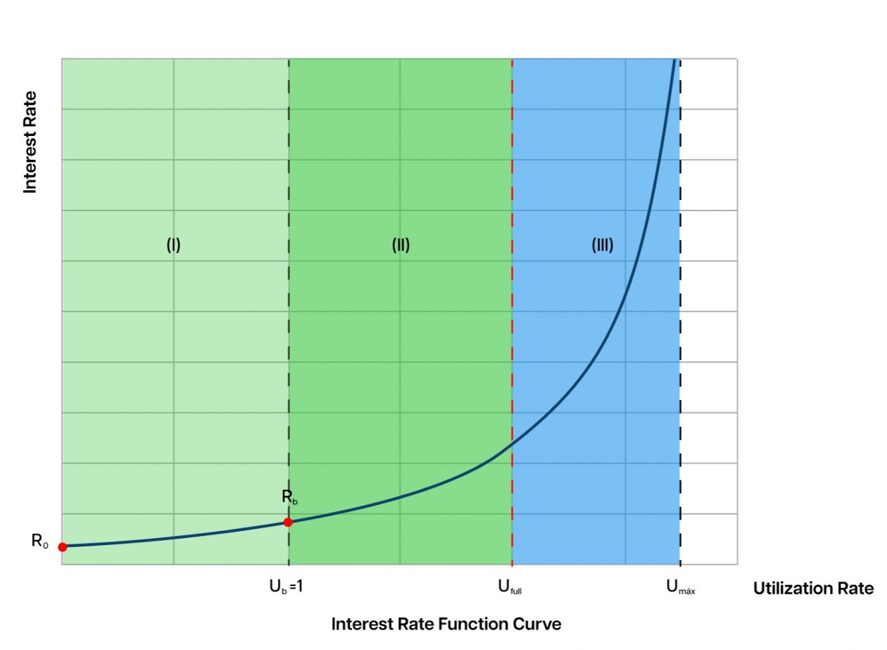 The borrow interest model is a continuous and differentiable function that diverges asymptotically from the maximum Utilization Rate. It acts as a natural barrier to credit demand as the level of utilization depletes protocol liquidity capabilities to prove new loans.
