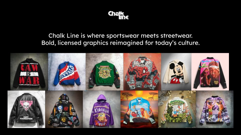 Chalk Line is a premiere apparel company from the mid-90s that works with some of the largest names in entertainment and sports IP – Disney, Marvel, NFL, WWE, Nickelodeon, NCAA, MTA, and countless others. Chalk Line pioneered “fanimation” and continues to deliver bold, in-demand apparel designs for superfans.