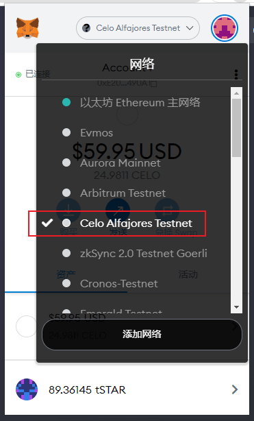 钱包选择celo测试网,如果不知道如何添加测试网, 可以参考1.0测试教程