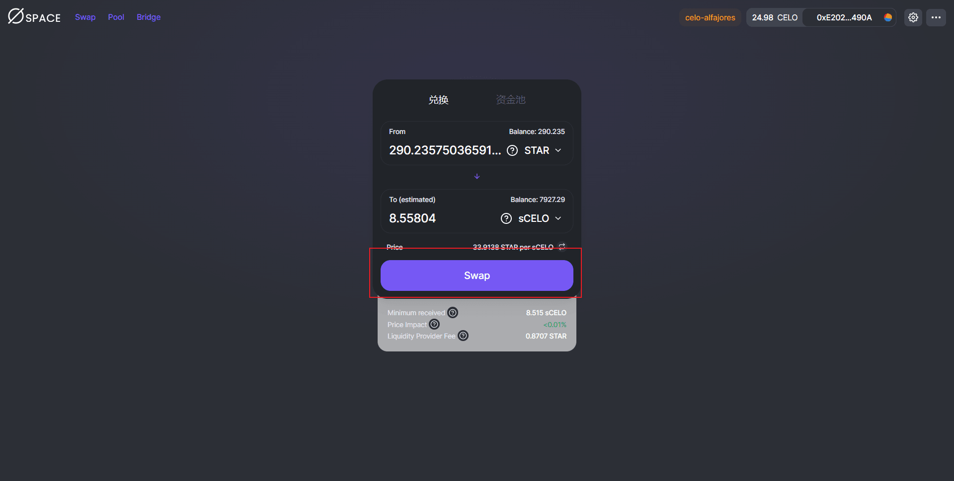 网络切换后可以正常兑换,注意再测试过程中,这个步骤要经常的做,官方的解释是celo网络有bug已经反馈解决。