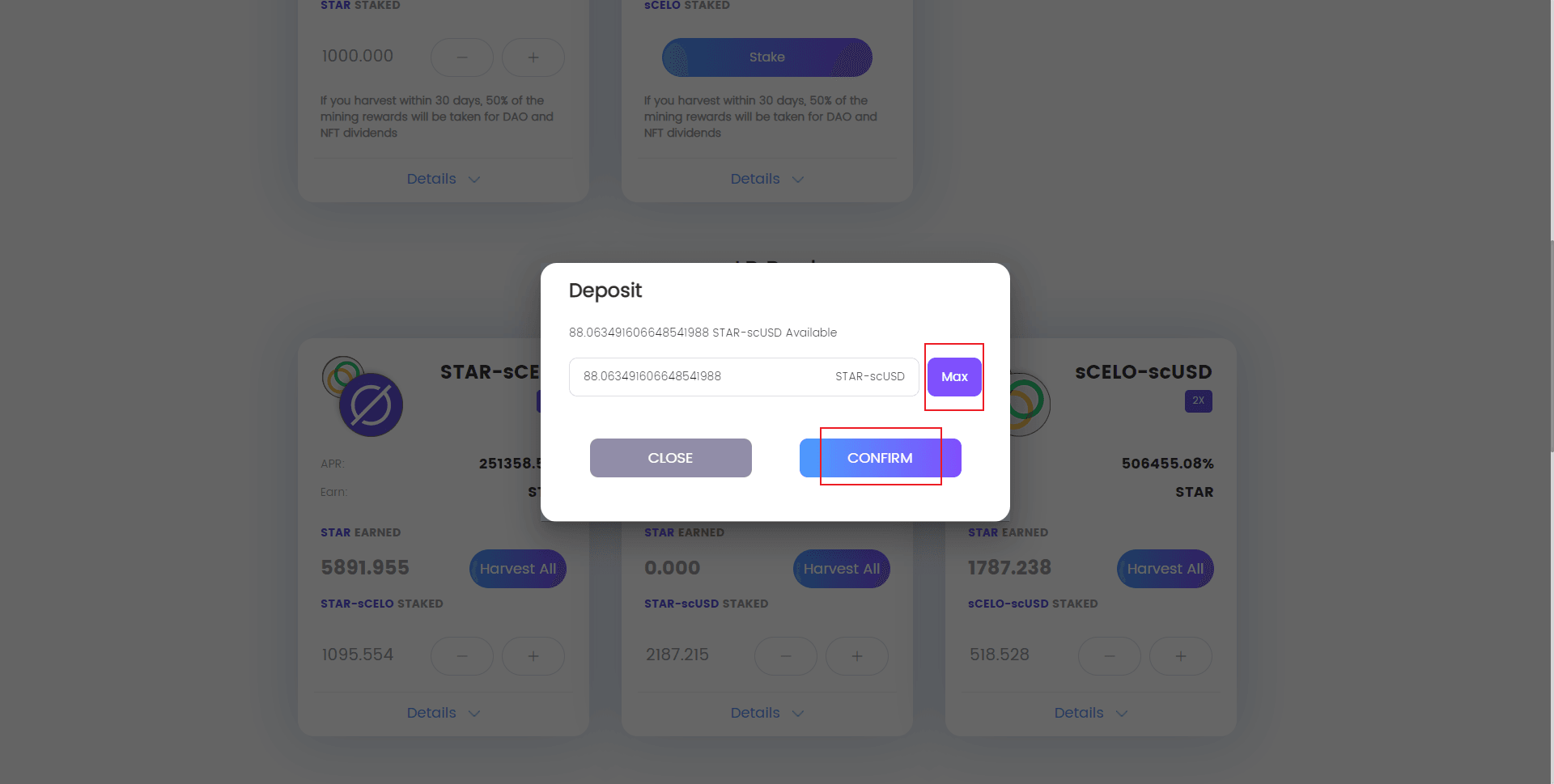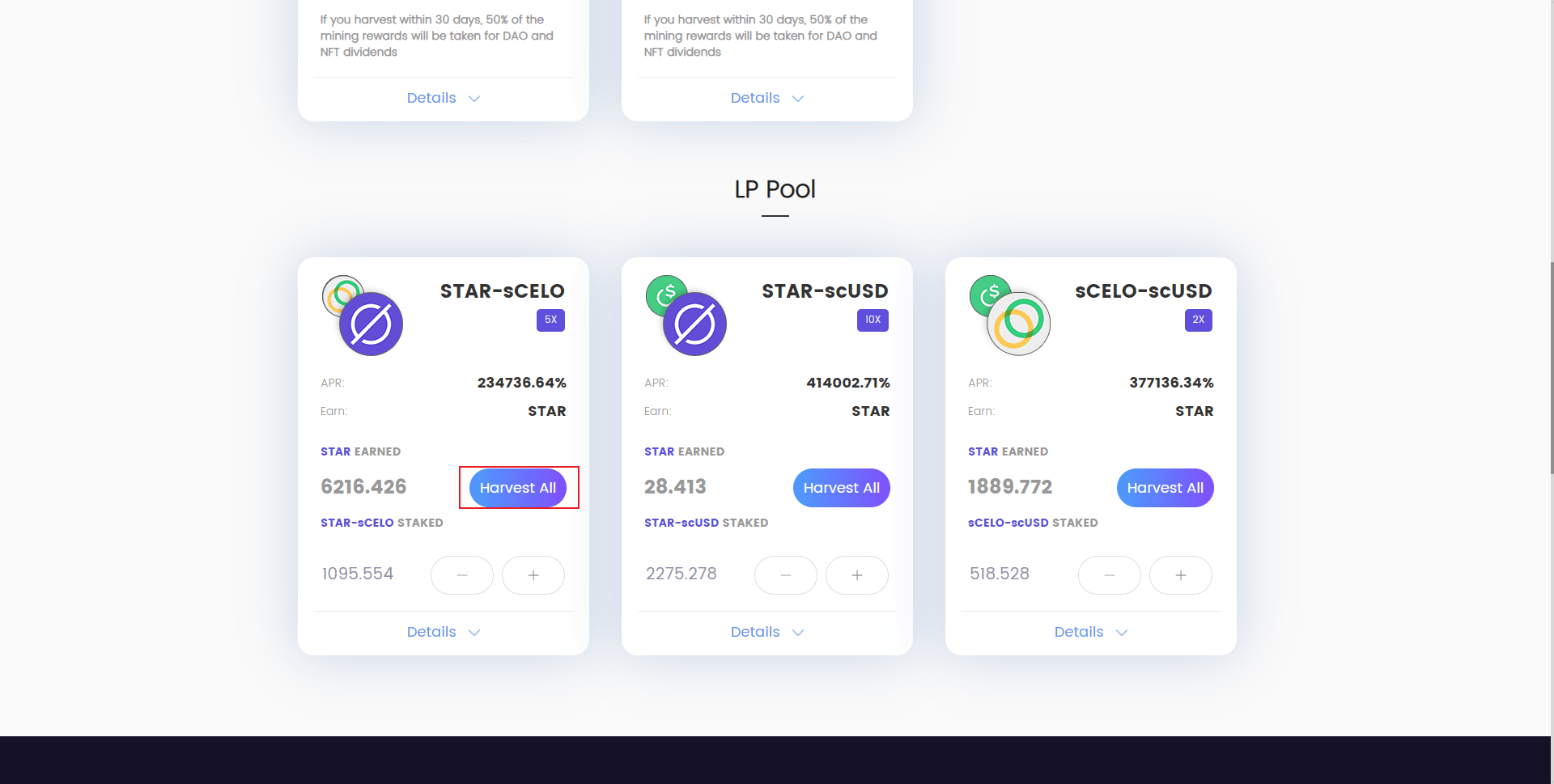 还是在当前页面,当我们添加过质押后,过一段时间就会显示奖励了。点击Harvest all 领取全部star奖励。