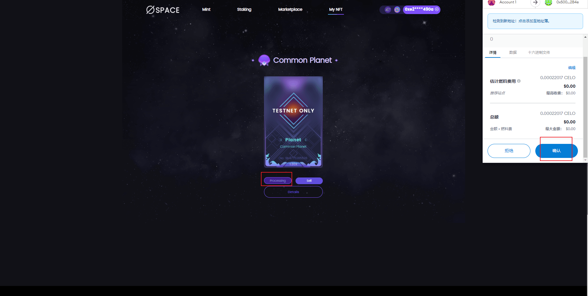 点击NFT左侧的staking按钮,进行质押。会先授权,然后才能质押成功。