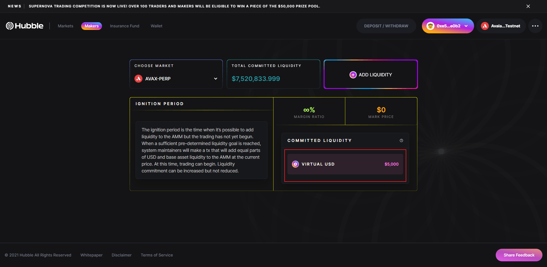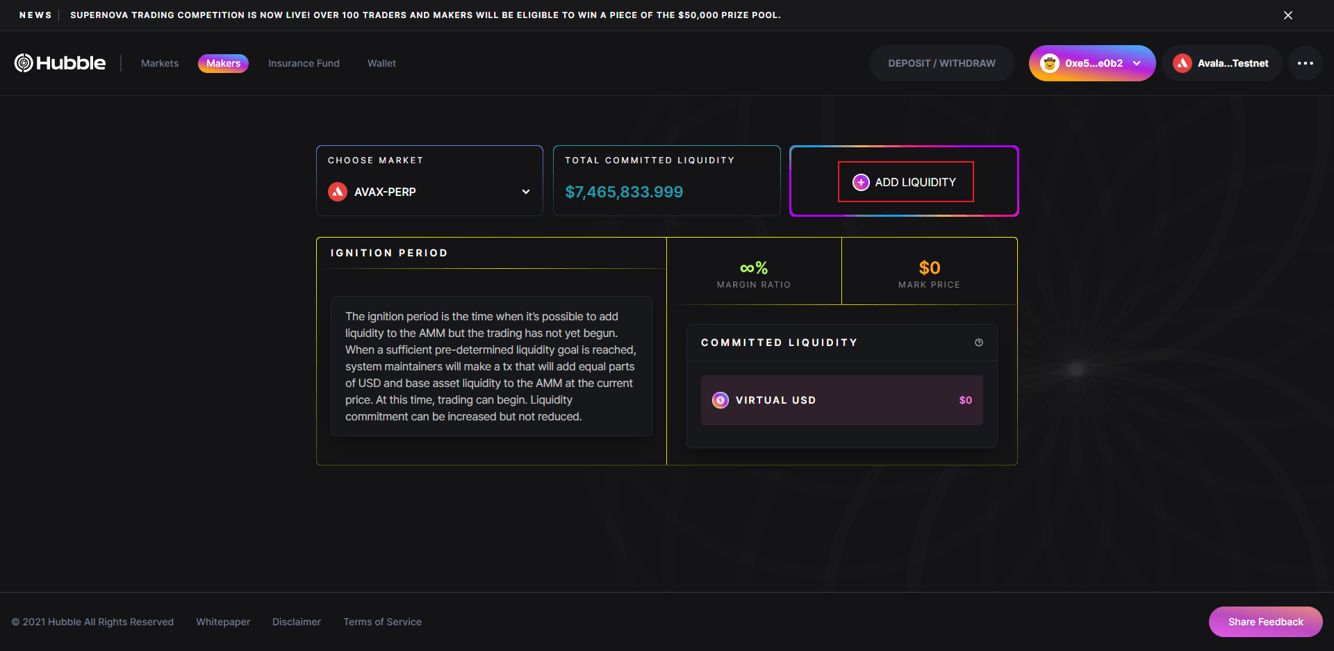 点击Makers页签,可以看到目前有3个交易对可以添加流动性。我们分别添加下流动性,这里以AVAX-PERP为例。