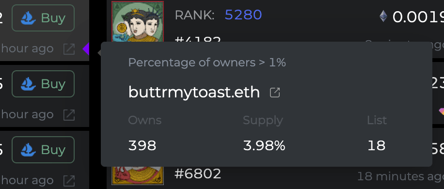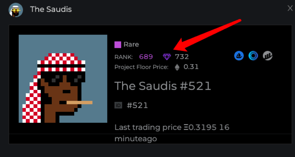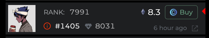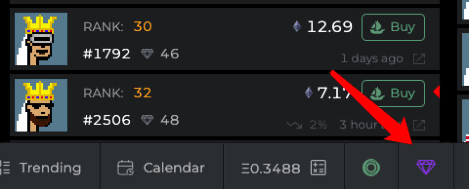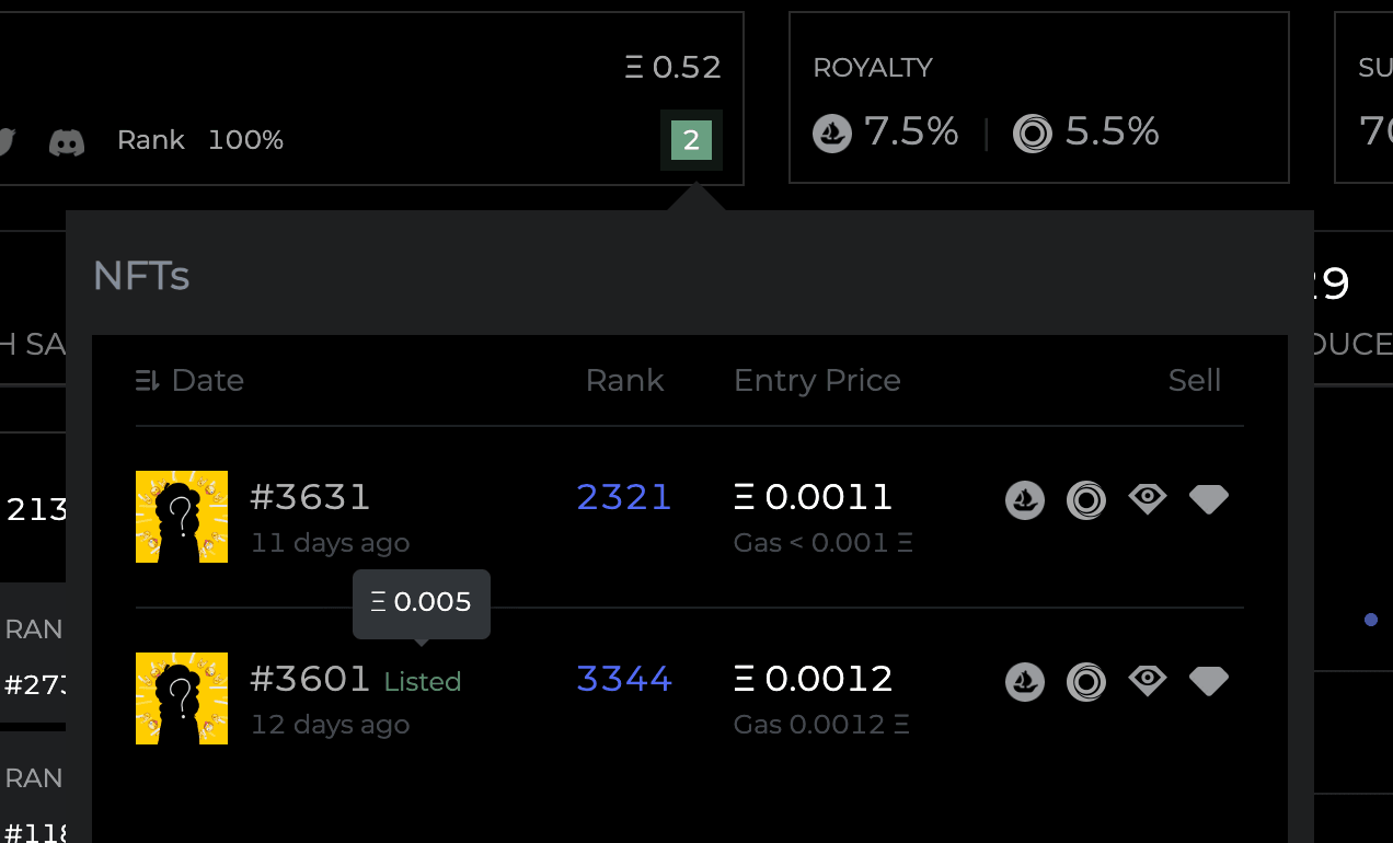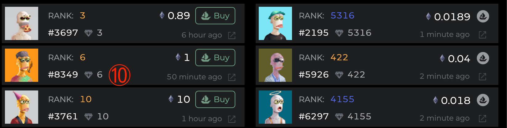 3,4,小钻石 和 蓝色小标识代表 该单是在 gem 或 genie 购买, gem&genie是扫单工具,可以批量购买NFT,如果在成交列表大量出现这2个小标识,代表购买欲望强烈,可能短时内会把地板价扫上去