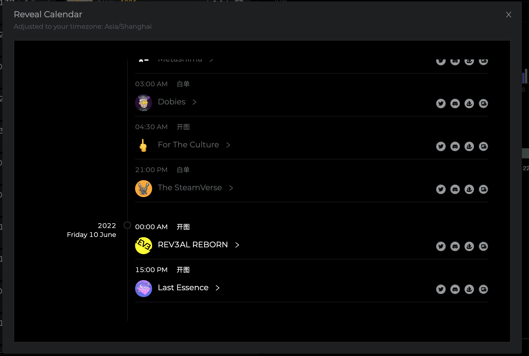 日历: 该日历根据用户当地时区显示时间,这里会展示项目的白单发售,公售,以及开图的时间。每一次时间节点都可能是一次操作机会