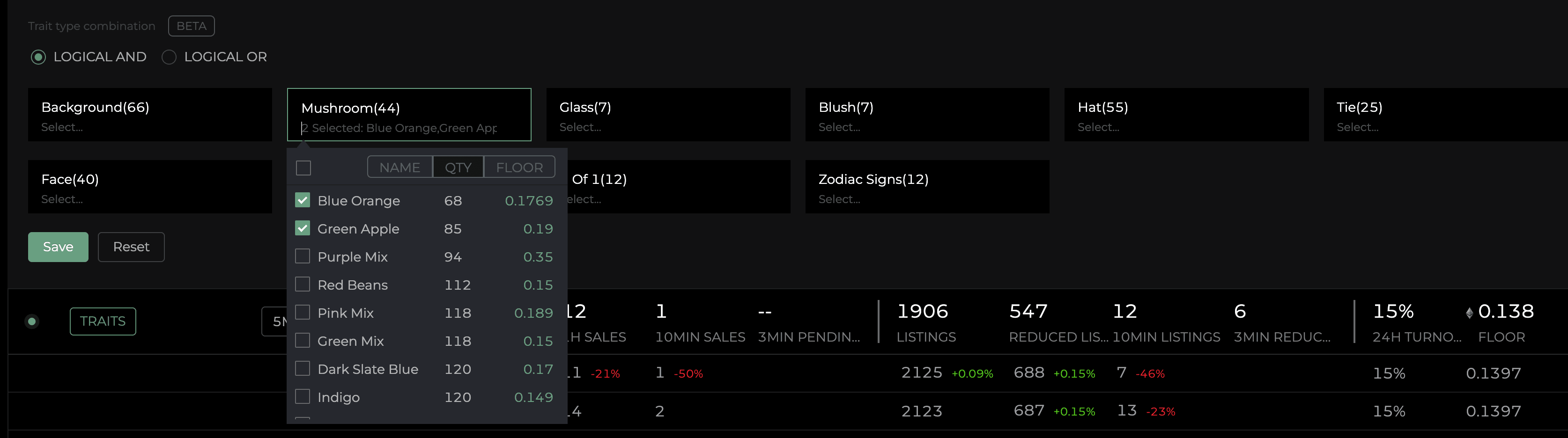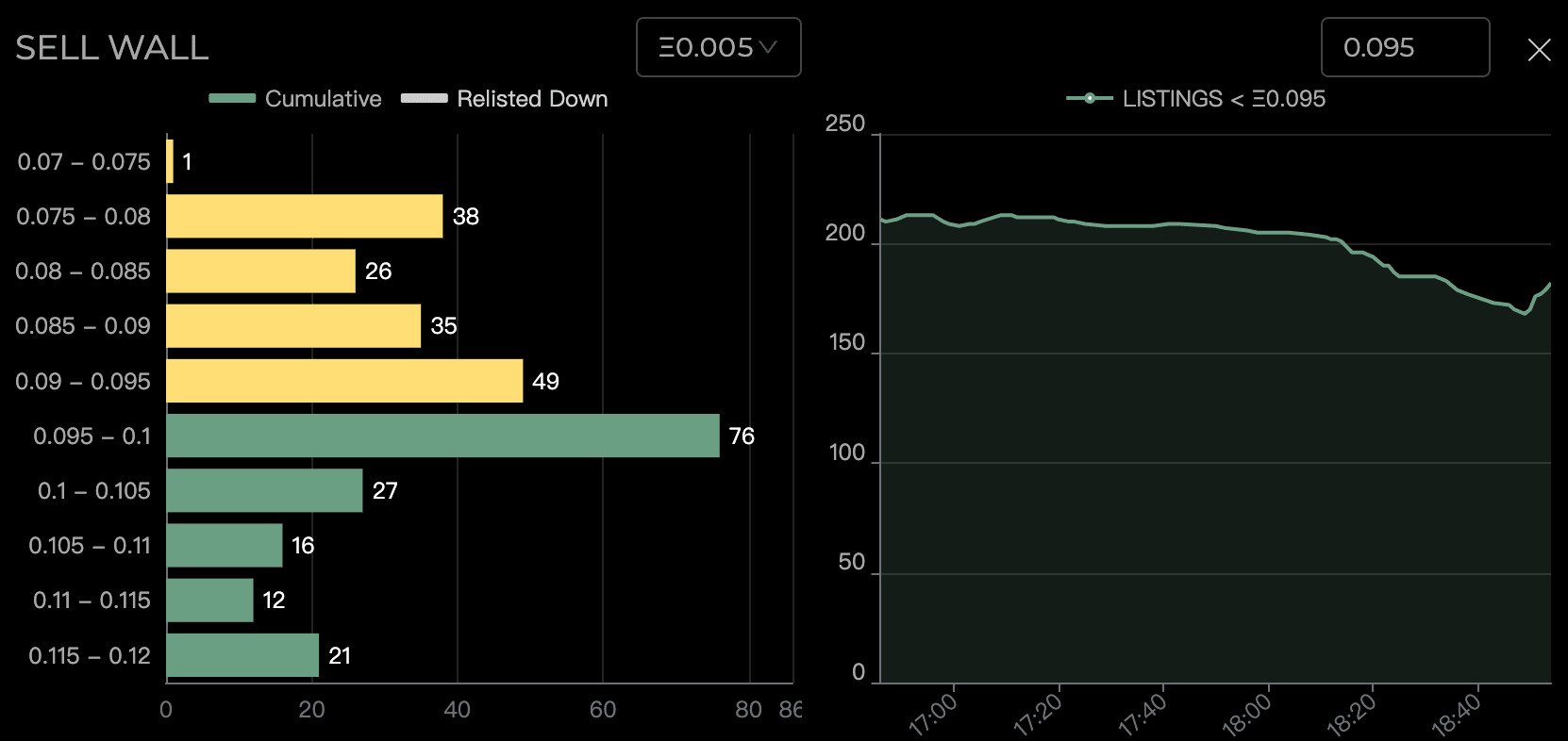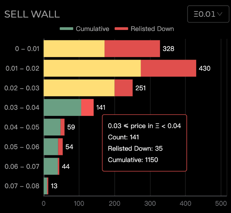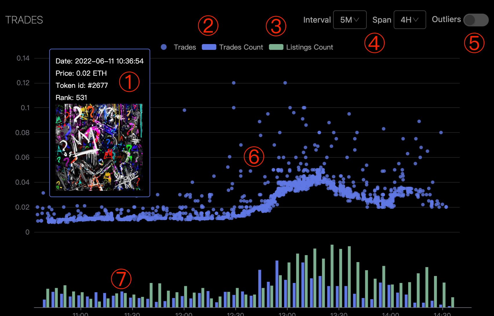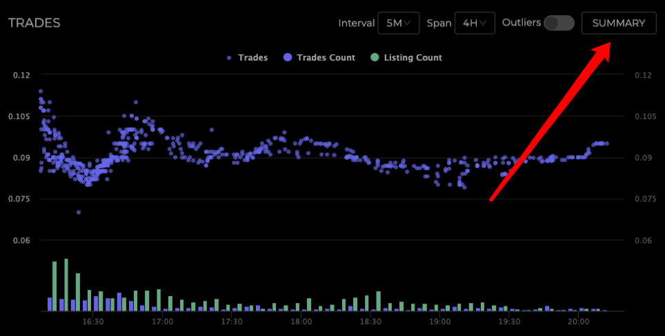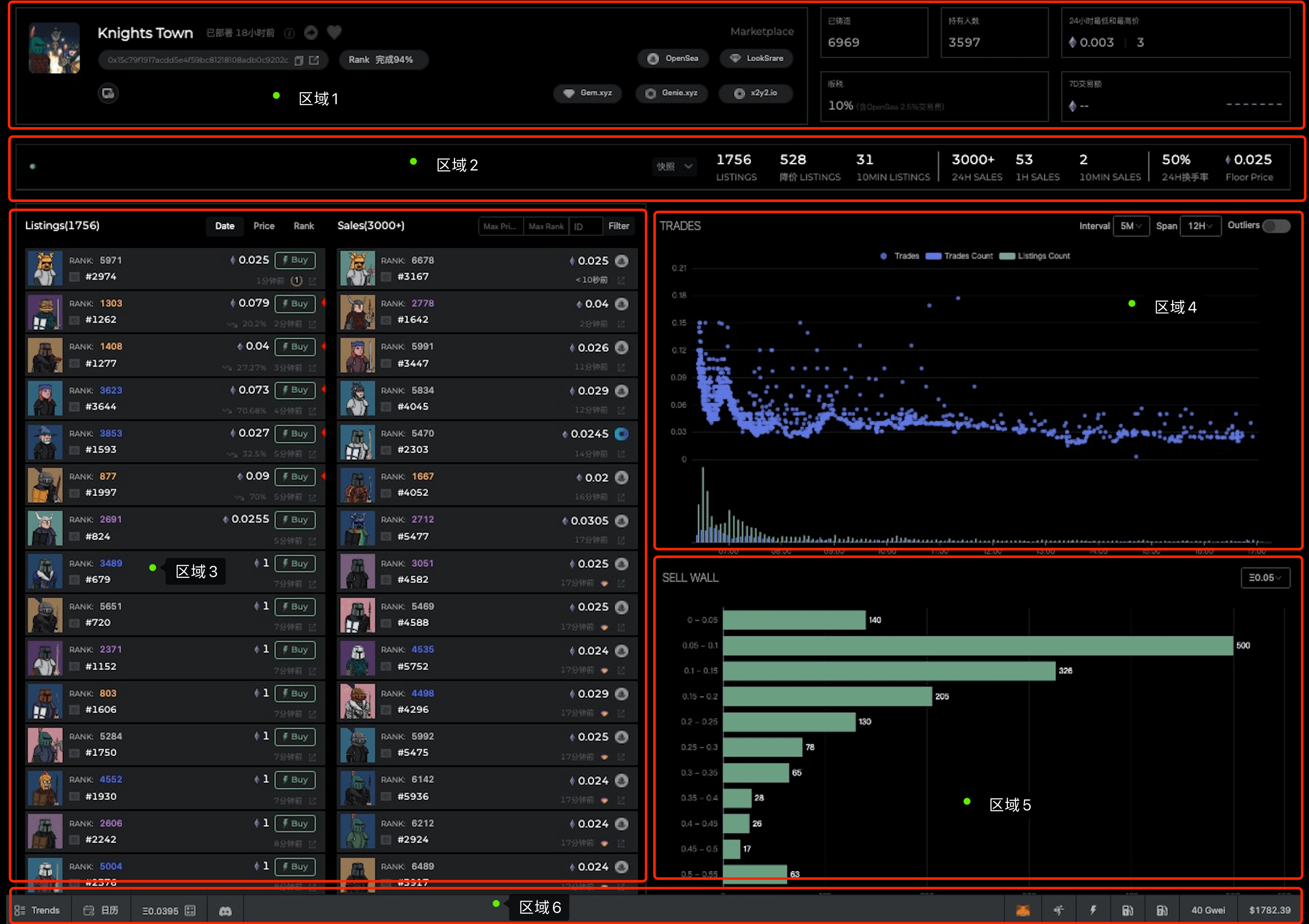 这里是散点区,每个点都表示一次购买,底部是listing和sales量的对比关系,在这个区域里,可以根据listing 和sales 量的强弱来提前判断走势,例如,当sales (蓝紫色柱子)高于listing(绿色柱子)时,说明买量强,如果持续,很有可能接下来是上涨行情,如果listing明显增强并持续高于sales,很有可能价格会下降