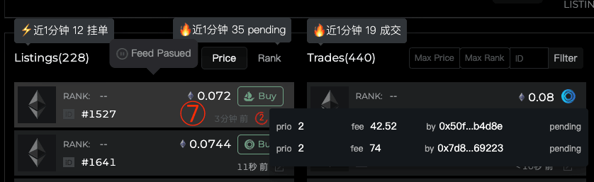 7,旋转的小图标代表pending, pending出现的越多代表买单力量越强。注:gem.xyz类的合约式购买或部分私人节点购买无法识别pending