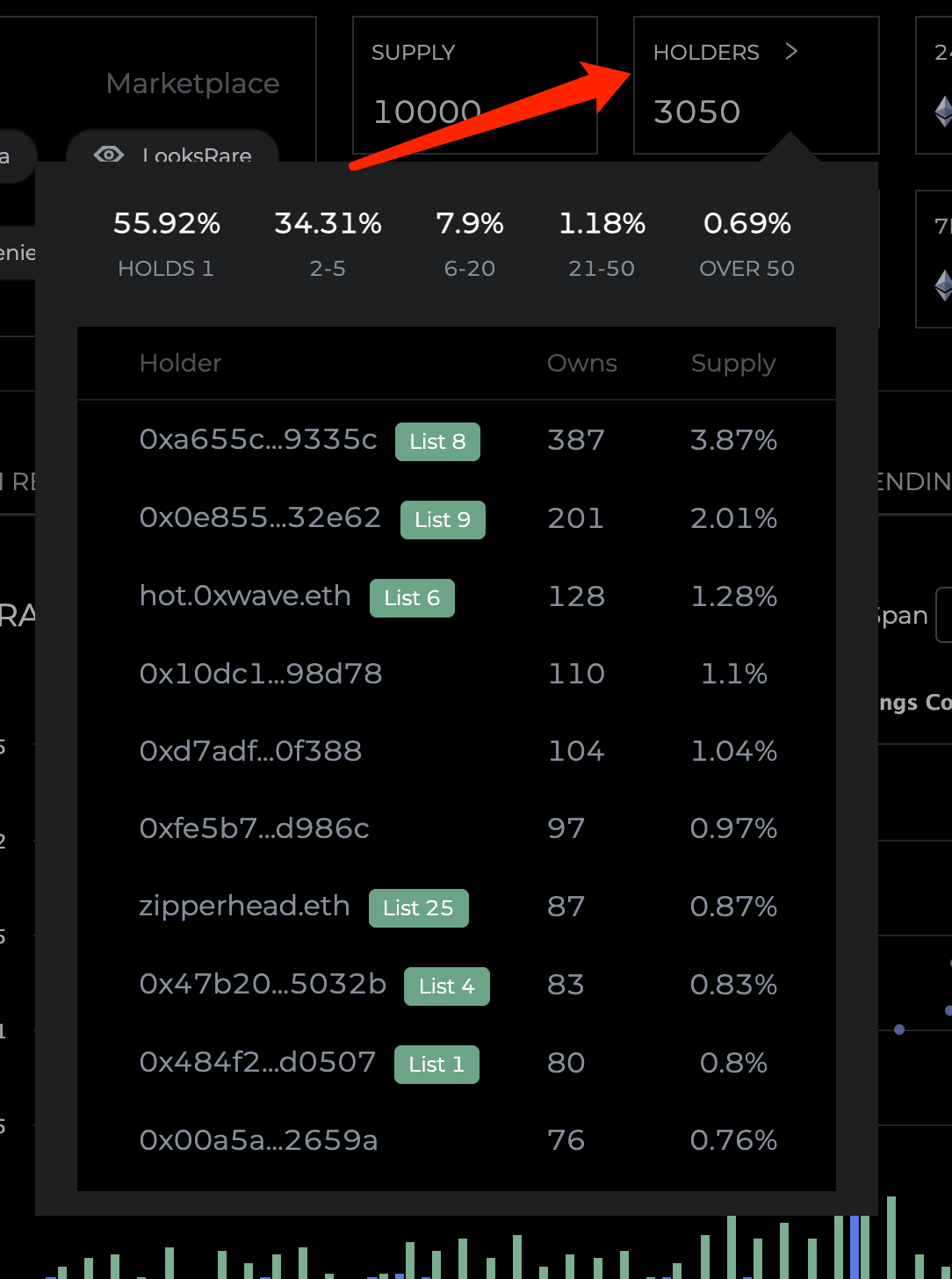 1)全部的listing数:表示该项目当前全部的listing,鼠标指向后会提示:挂单率,是指全部listing占总项目的百分比,一般来讲,最好不要超过10%