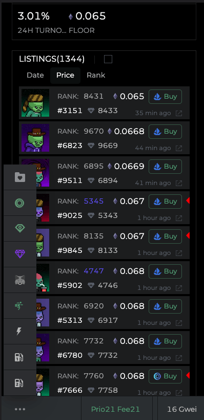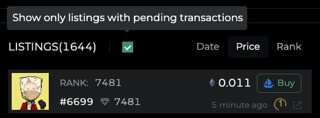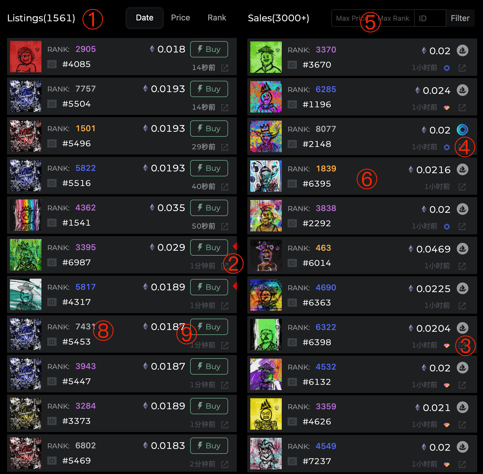 1,listings列表:可按照 最新的时间(Date), 地板价(Price), 稀有度(Rank) 来进行排序,通常,可以切换到地板价(Price)排序,来观察最新价格的变动