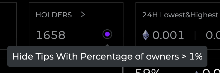 项目内增加持有超过1%拥有者提示(紫色三角,可以在HOLDER处开启或关闭),如果在挂单列表出现,代表大户在出货,如果在成交列表出现,代表大户在买进