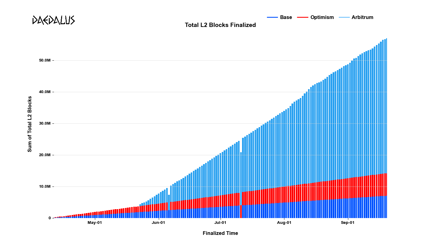 In fact, as the below chart illustrates, although there are more operators overall on Optimism and Base, significantly more blocks are actually being finalized on Arbitrum (8x more blocks per day than Base and Optimism).