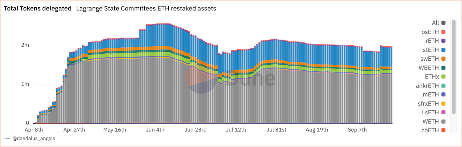 Lagrange State Committees were the first ZK AVS launched on EigenLayer mainnet, and found product-market fit at an impressive pace. Within a few weeks after the mainnet launch, the value of restaked ETH surpassed $6bn (peaking at ~$9bn in early June), and still currently sits close to $5.5bn or 2 million restaked ETH: