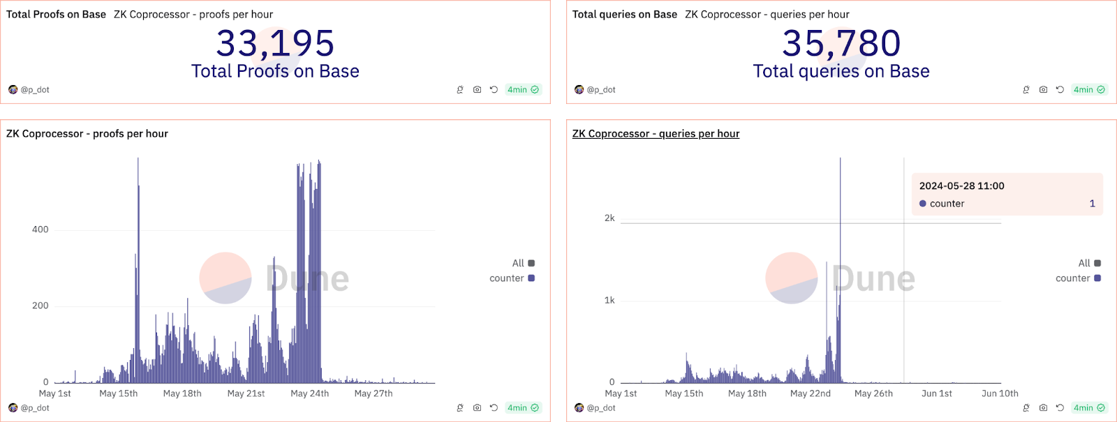 A major recent milestone for Lagrange was the launch of the Euclid Testnet, which introduced Ethereum's first verifiable database and ZK Coprocessor. Aggregated on-chain activity shows significant participation in the first phase of testnet that ran until May 24th, with over 33,000 proofs generated on Base: