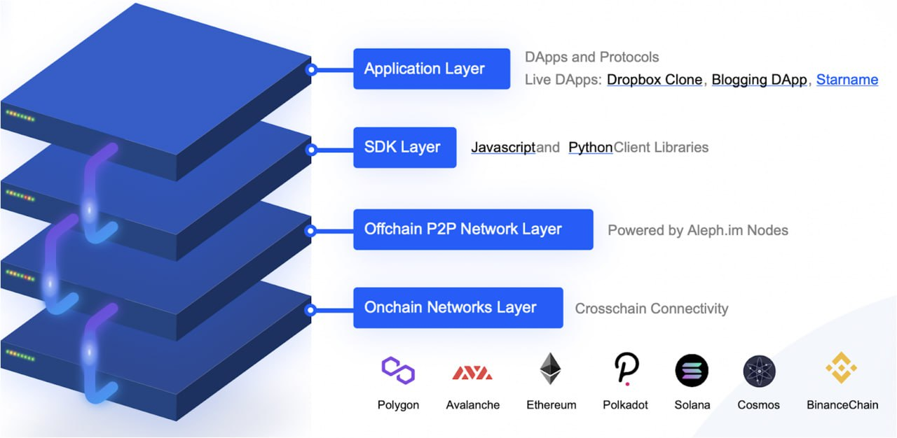 使用Aleph.im,开发者可以构建没有集中式组件的dApp。数据存储和业务逻辑在Aleph.im不可阻挡的去中心化网络上运行,而不是在AWS或Google Cloud等集中式服务上运行。这是第一代完全去中心化的应用程序。