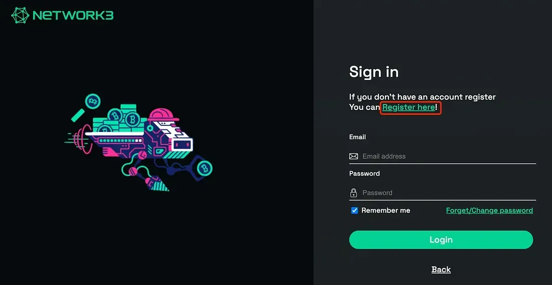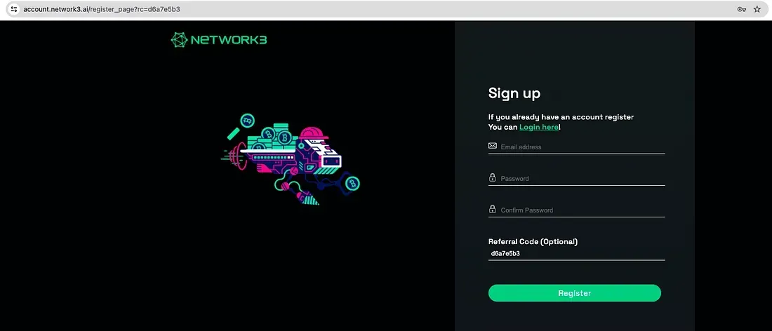 Người dùng B nhập địa chỉ email và mật khẩu để tạo tài khoản mới trên Network3. Nhấn "Register" để chuyển đến bảng điều khiển trạng thái.