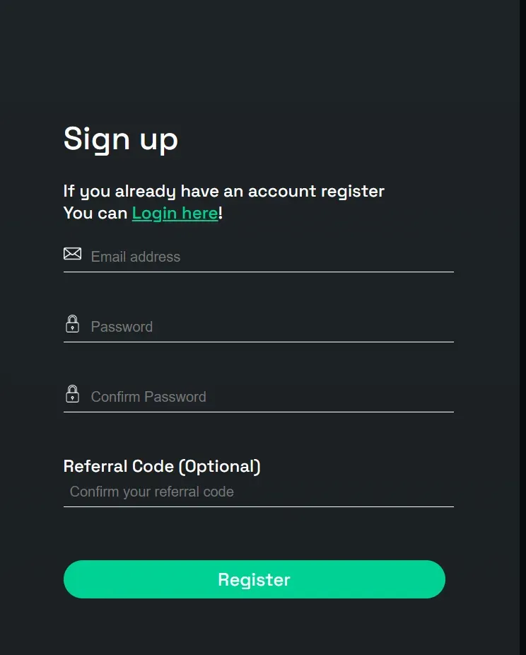 Cung cấp thông tin của bạn bằng cách điền vào các trường bắt buộc, bao gồm địa chỉ email, mật khẩu và mã giới thiệu (nếu có) trên trang đăng ký.