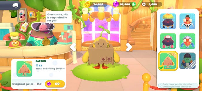 Among the costumes in the PuffGo Store, there are 2 different gears — Level S and Level A. Note that the costumes in different gears will be valued diversely with corresponding Luck Value. The prices to trade** Level S costumes are 299 Diamonds per piece** and 159 Diamonds per piece for Level A costumes . You can notice that Level S costumes are rarer with higher Luck Value than Level A costumes, which is 282 Luck Value for each Level S costume and 158 Luck Value for each Level A costume . Please check here for the details of the Luck Value boost.