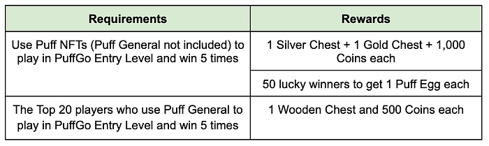 💡 You CAN ONLY win 1 type of reward with 1 fulfilled requirement during the activity period. No repetitive winning under 2 conditions. For instance, if you have already played with NON-Puff-General NFTs in PuffGo Entry Level and won 5 times, at the same time, you have also played with Puff General NFTs in PuffGo Entry Level and won 5 times, even with 2 fulfilled requirements, you CAN ONLY receive the higher rewards — 1 Silver Chest, 1 Gold Chest, and 1,000 Coins.