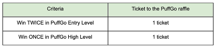 1️⃣ Puffs who have won TWICE in PuffGo Entry Level or ONCE in High Level during this period of time for Activity #2 will be granted 1 exclusive ticket for the PuffGo raffle and eligible for raffle prizes, which is 1 Puff Egg each for 10 lucky winners every day . If you have won 4 times in Entry Level or twice in High Level, which means your winning times are doubled, and you will be also granted the doubled tickets for the raffle.