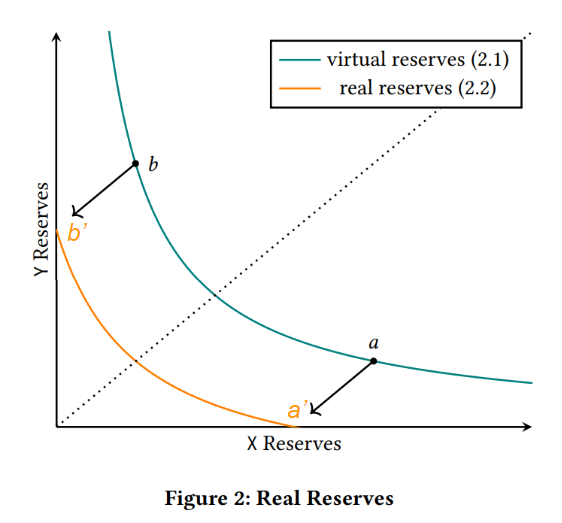 Trong whitepaper Uni V3, họ không dịch chuyển hệ quy chiếu. Thay vào đó, họ dịch chuyển đồ thị từ đường cong virtual reserves (màu xanh) về đường cong real reserves (màu vàng), từ điểm a → a’ và từ b → b’.