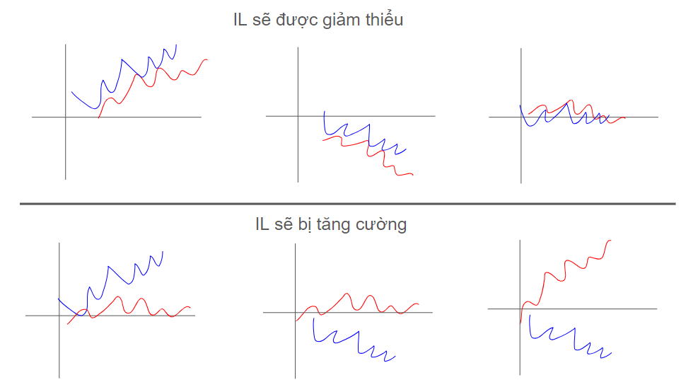 Có nhiều kỹ thuật để ngăn chặn IL mà vẫn đạt được hiệu suất sử dụng vốn cao. Nhưng kỹ thuật đơn giản nhất mà ai cũng có thể làm được, đó là nên đóng góp thanh khoản cho những cặp tài sản có xu hướng di chuyển cùng chiều nhau. Ace hãy nhìn mấy cái hình vẽ giun dế ngoằn ngoèo dưới đây (đừng có cười, mấy đường ngoằn ngoèo này có thể cứu tế cái portfolio cho ace lúc nào đó chưa biết chừng đó):