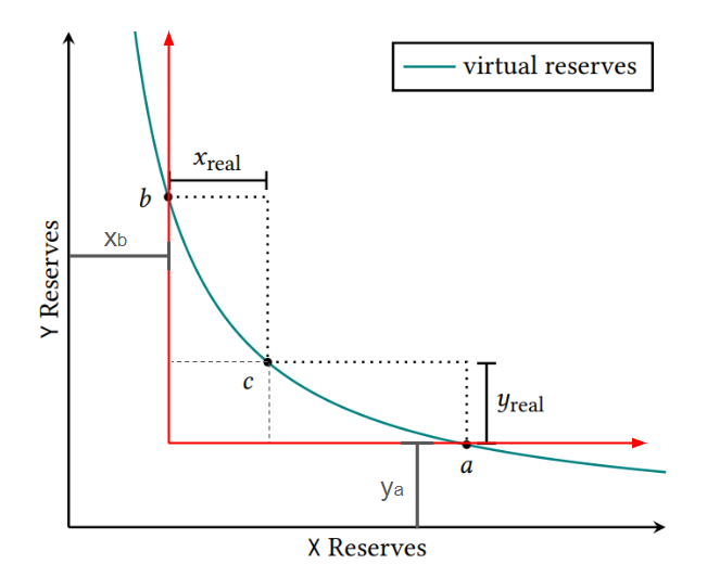 Hay nói cách khác, phần reserve (đường cong màu xanh) ở trên chỉ là ảo vì đường cong đó thể hiện x và y có thể chạy từ (0,∞), nên trong whitepaper Uni V3 gọi đó là đường virtual reserves. Trên thực tế, x_real sẽ không thể chạy được vượt quá giá trị Xa, và y_real sẽ không thể chạy vượt quá giá trị Yb. Nếu biểu diễn bằng một hệ quy chiếu tốt hơn (hệ quy chiếu màu đỏ), ta sẽ thấy ta cần dịch chuyển hệ quy chiếu cũ (X_reserves, Y_reserves) đi 1 khoảng là (Xb, Ya).