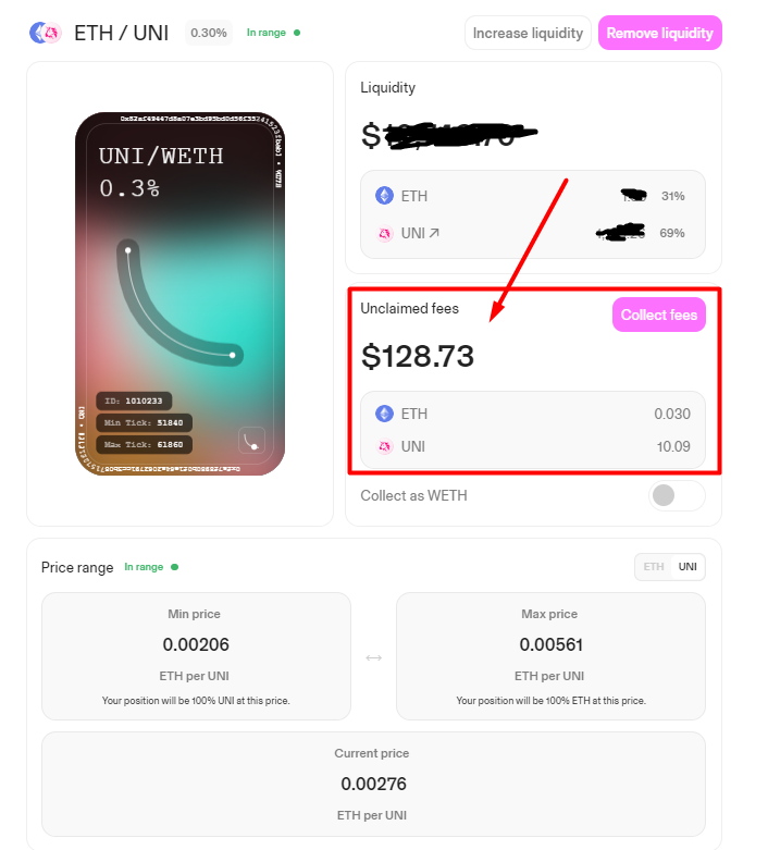 Và hiện nay, so far là mọi thứ đang hoạt động ổn định. Pool đang tự động collect fee cả bằng UNI lẫn ETH cho tôi hàng ngày. Theo tính toán của tôi thì lợi tức từ pool này mang lại tầm 25% gì đó. Ở mức rủi ro bình thường, lợi nhuận bình thường.