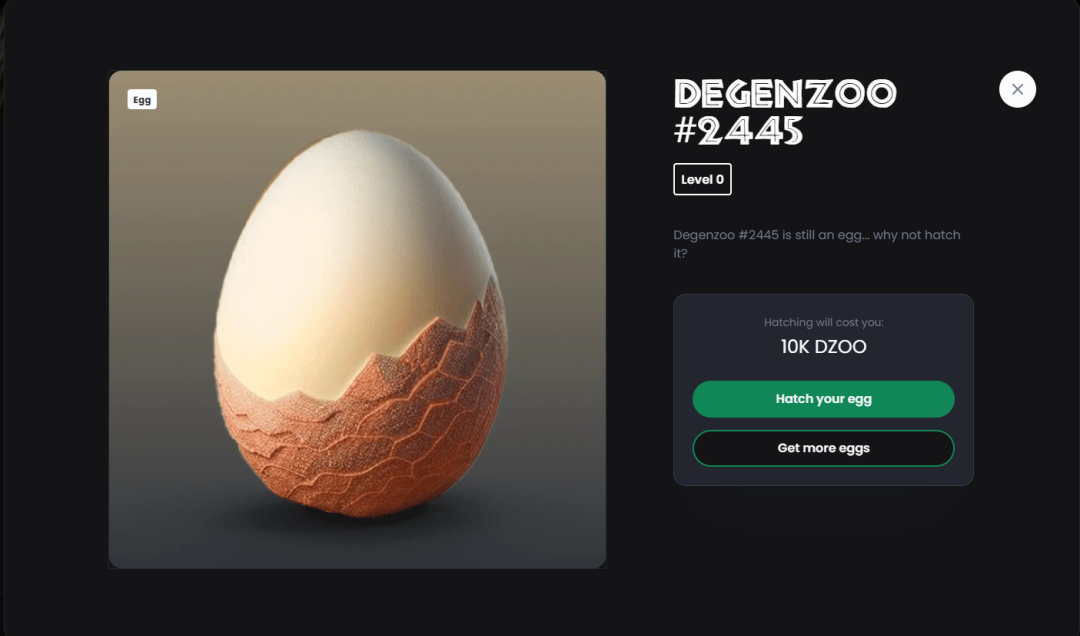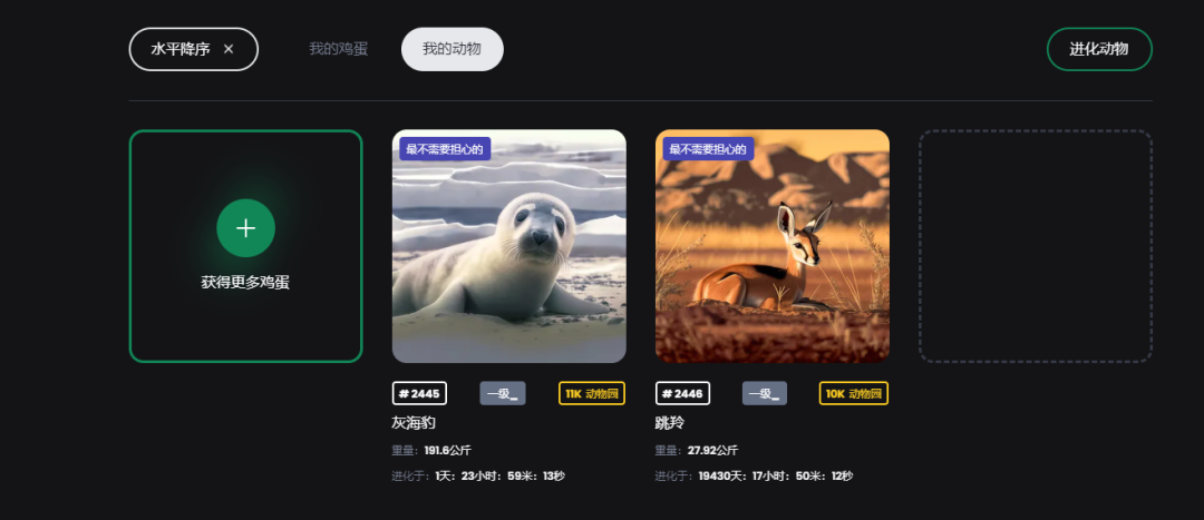 每个宠物蛋需要1w的dozz来进行孵化就可以获得你的动物、并且你的动物需要时间就可以长大、长大的动物可以通过杀死就可以获得dozz、如果当你的动物数量越稀少、那么获得dozz的数量就越多。