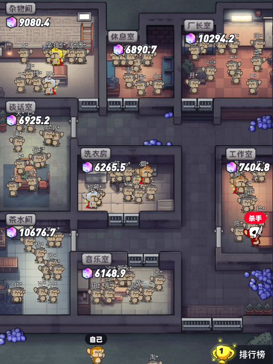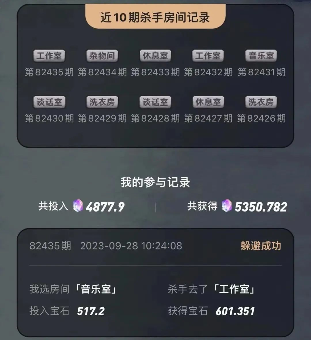 游戏总共8个房间、时间到了就会有杀手随机杀死一个房间的所有人、然后把杀死的宝石平分给其余7个房间的所有人!