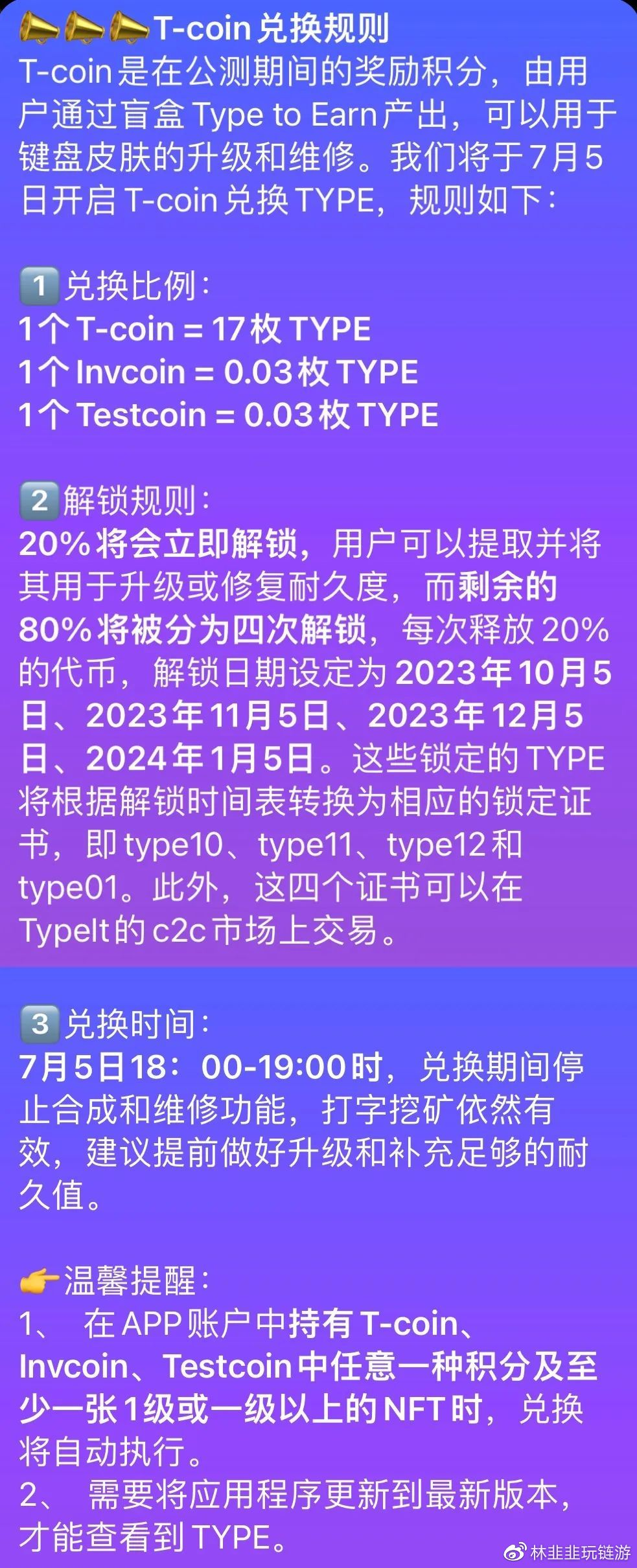 昨天晚上公布了tcoin兑换type的规则、因为今天晚上type就要上线bitget。1个tcoin兑换17个type。差不多一个type的兑换过来是0.05.和私募的价格一样。但是今天tcoin的价格就有小幅度的上涨。一般大家都知道项目开盘的价格一般都会有几倍幅度的增长。所以晚上大家可以关注一下bitget上线情况看看有没有机会套利。
