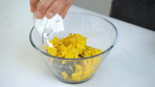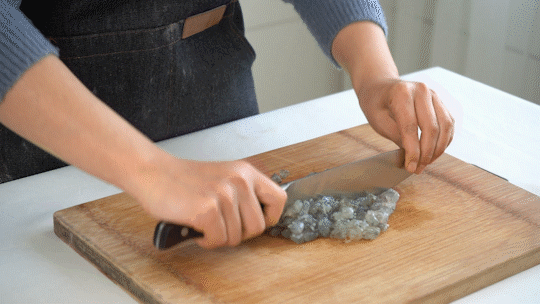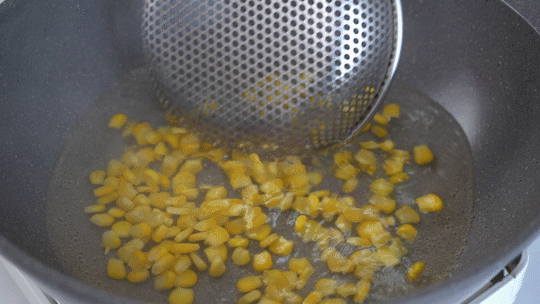 step 2 将玉米粒倒入锅内,用热水焯水2分钟,然后将焯水后的玉米粒剁碎。