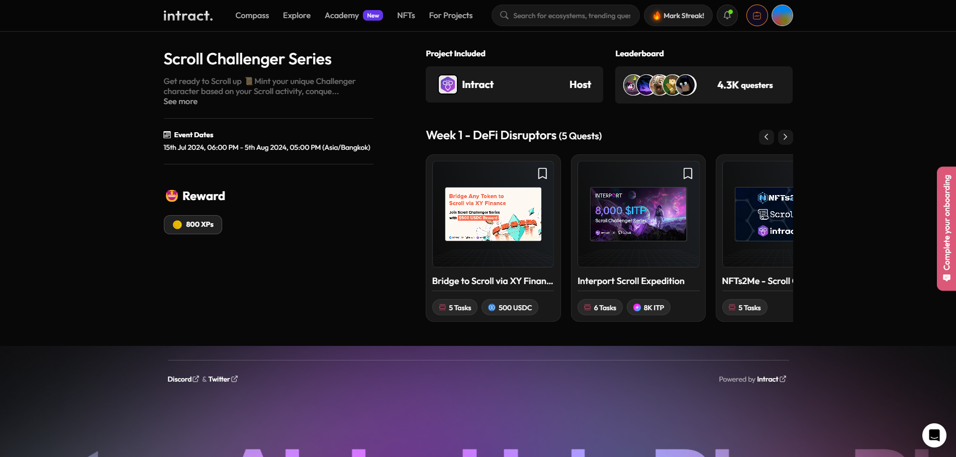 The Intract Campaign team is hosting their "Scroll Challengers" campaign this week.Tackle weekly quests, score EPIC rewards from partners, and mint your one-of-a-kind Challenger character starting week 2 based on your Scroll activity!