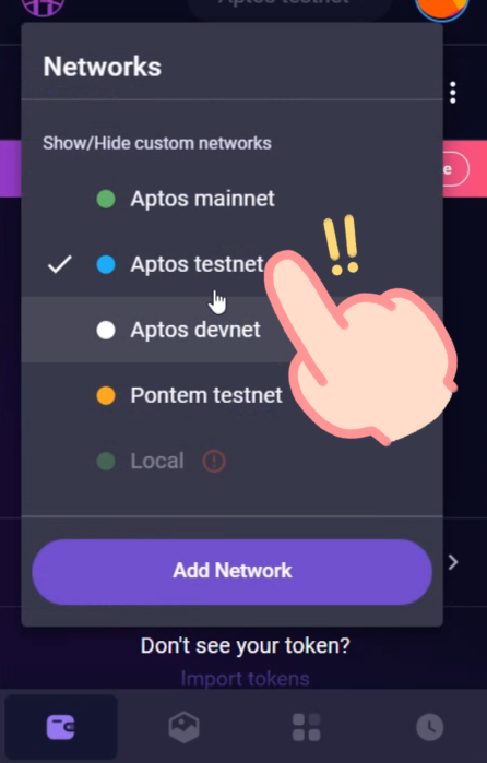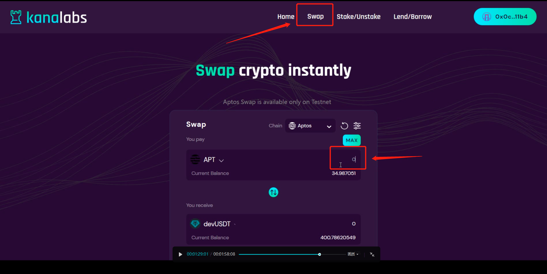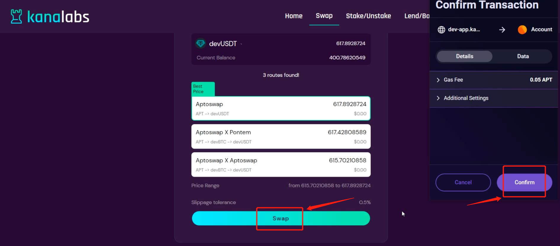 ● 交互:使用 Pontem 钱包在项目的 Aptos 测试网中进行聚合交换;