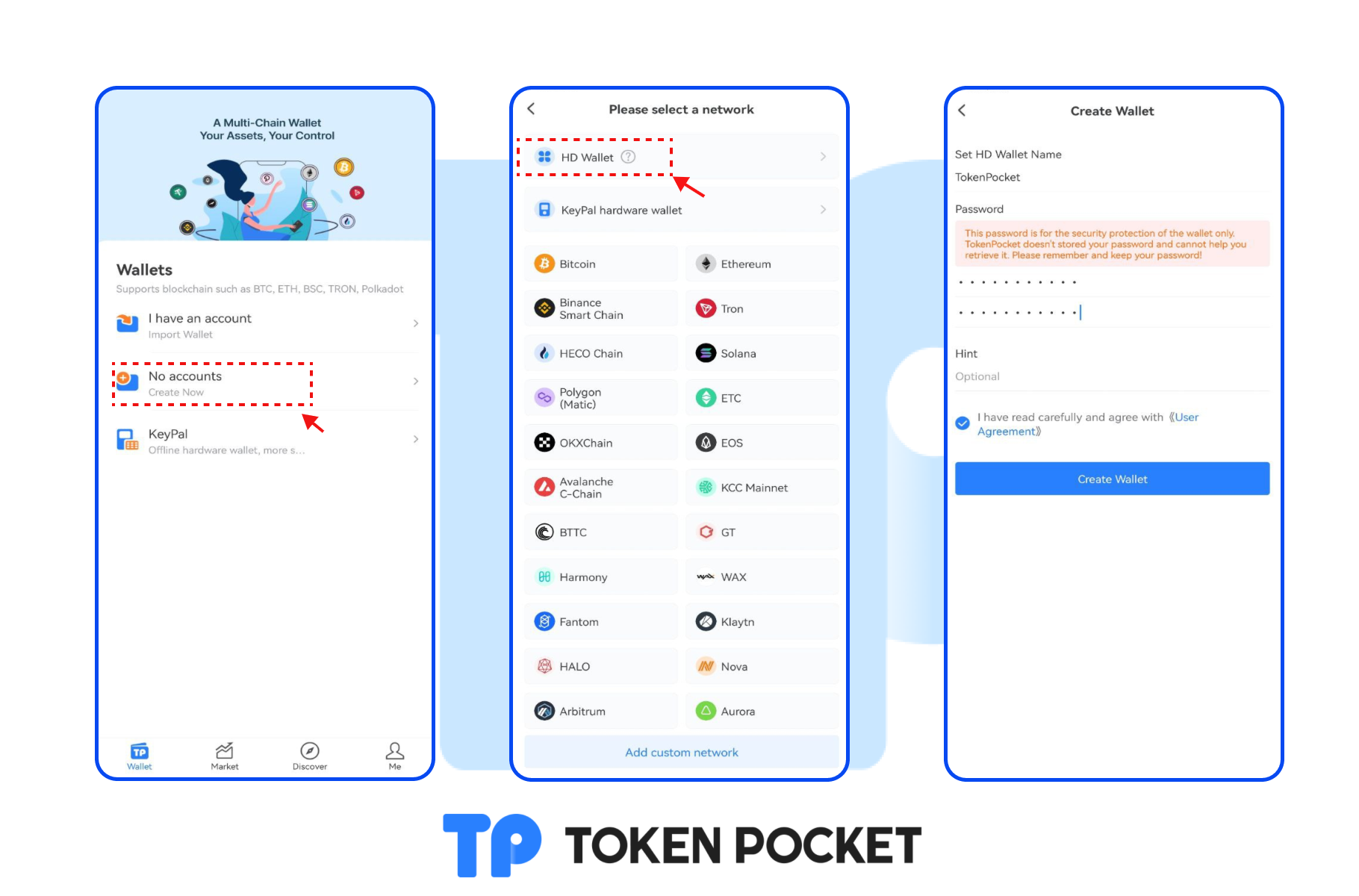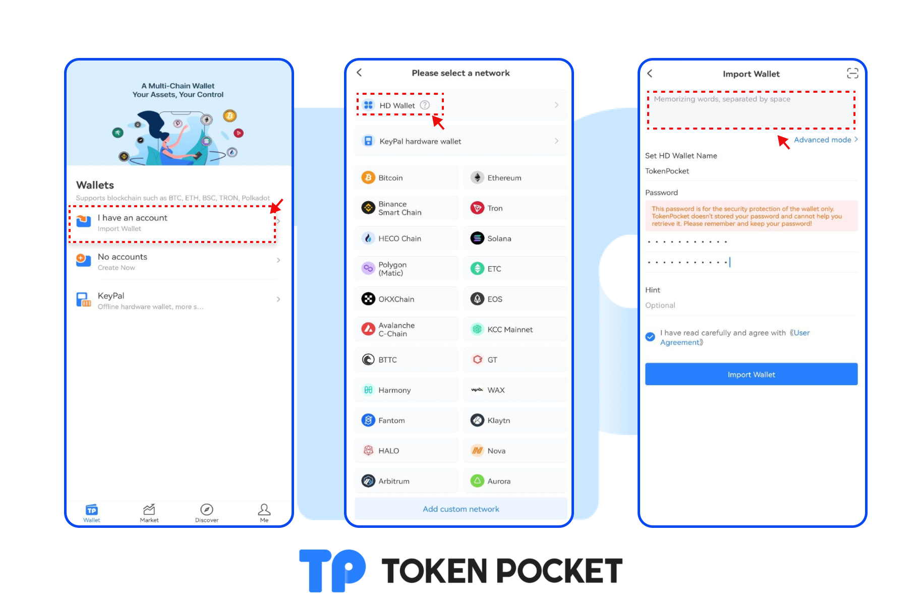 Click [I have an account] > Choose [HD Wallet] or choose a public chain > Enter your Secret Recovery Phrase and set the wallet name and password.