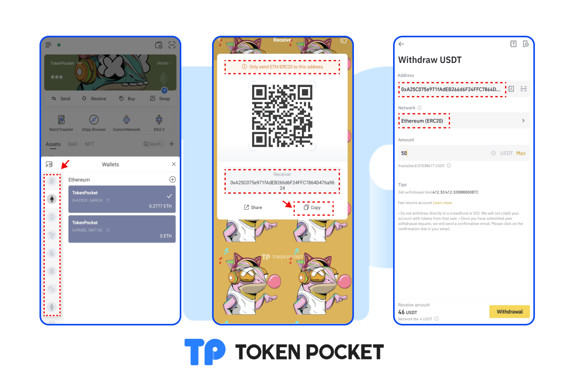 TokenPocket Assets page > Choose the transfer Public chain > Click [Receive] > Copy the [Receiver] > Paste your TokenPocket wallet address to the transfer page of the exchange or other decentralized wallet > Click [Withdraw] > Withdrawal operation successfully.