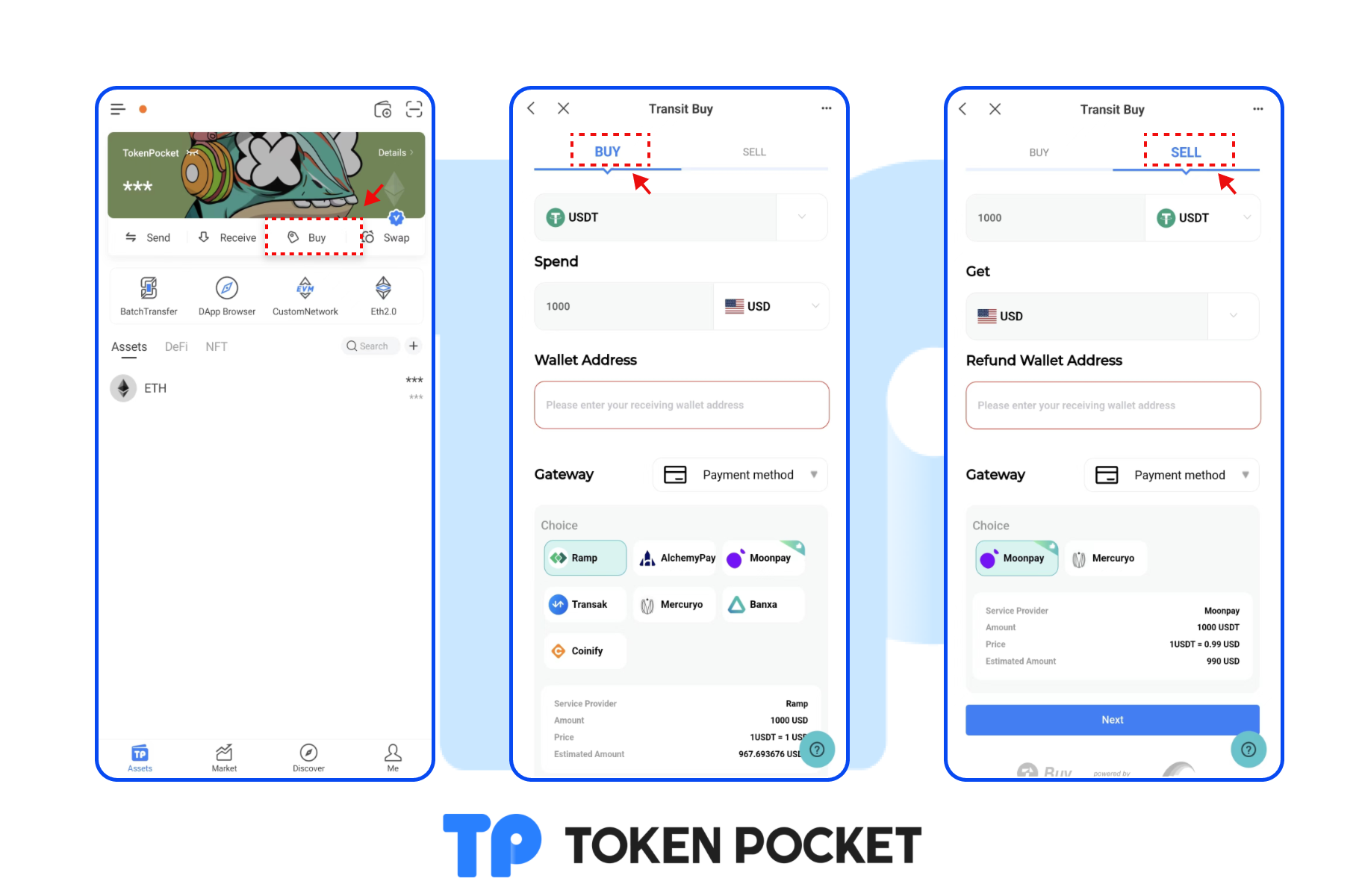 TokenPocket Assets page > Click [Buy] > You can choose [BUY] or [sell] button to experience the one-stop experience of Fiat-crypto buy and sell.