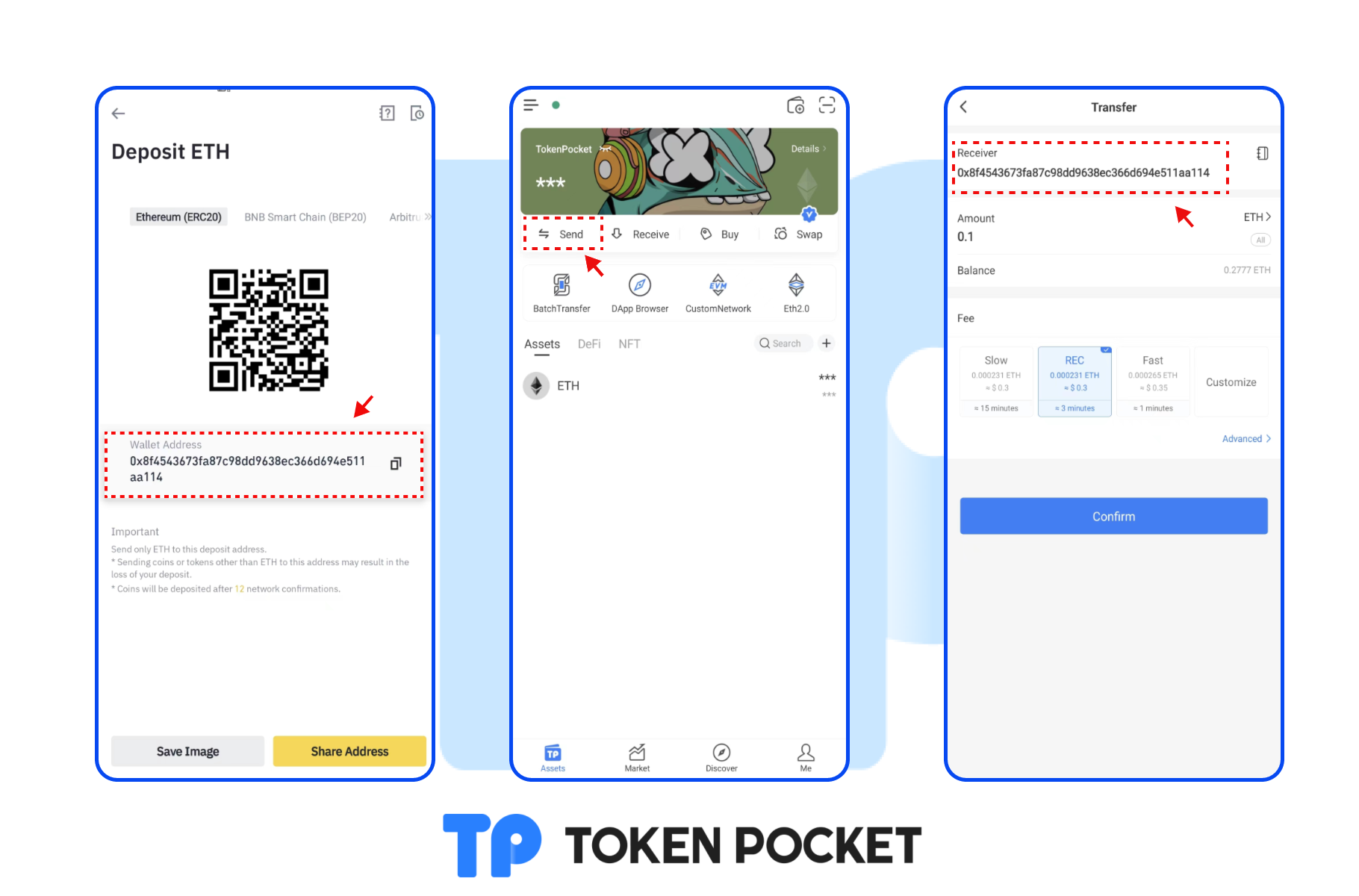 Exchange Deposit page > Copy the exchange wallet address > Open TokenPocket Assets page > Click [Transfer] > Paste your exchange wallet address to the [Receiver] > Enter the amount > Pay for the gas fee > Deposit operation successfully.