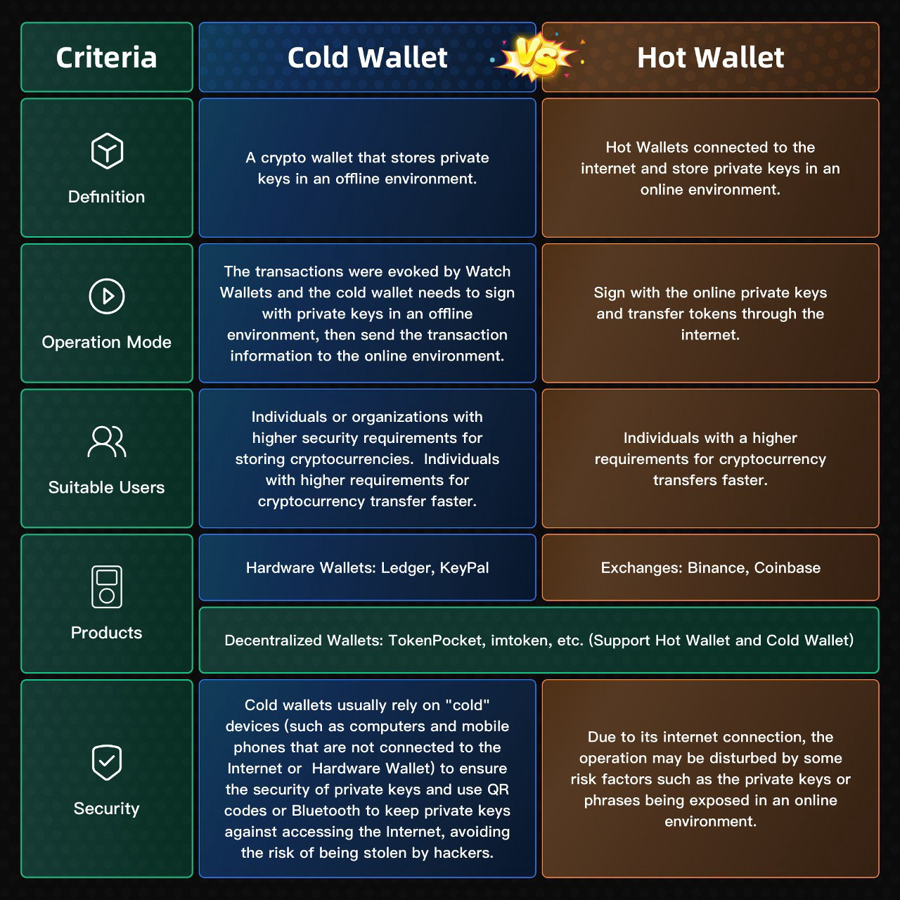 After learning the difference between a cold wallet and a hot wallet, choosing a wallet to store your crypto assets is critical. Wallet security should be the highest priority in the selection process. Cold wallets can better protect the security of the wallet's private key in an offline environment. Of course, there will be users who prefer the convenience of transferring cryptocurrencies and realizing fast online transactions, thus they prefer to choose the hot wallet. This requires users of Hot Wallet to be more careful about backing up their private key or secret recovery phrase and keeping it in a safe place.