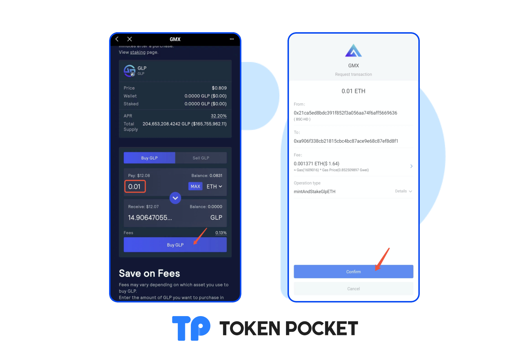 Enter the ETH amount you want to pay and click [Buy GLP], click [Confirm].