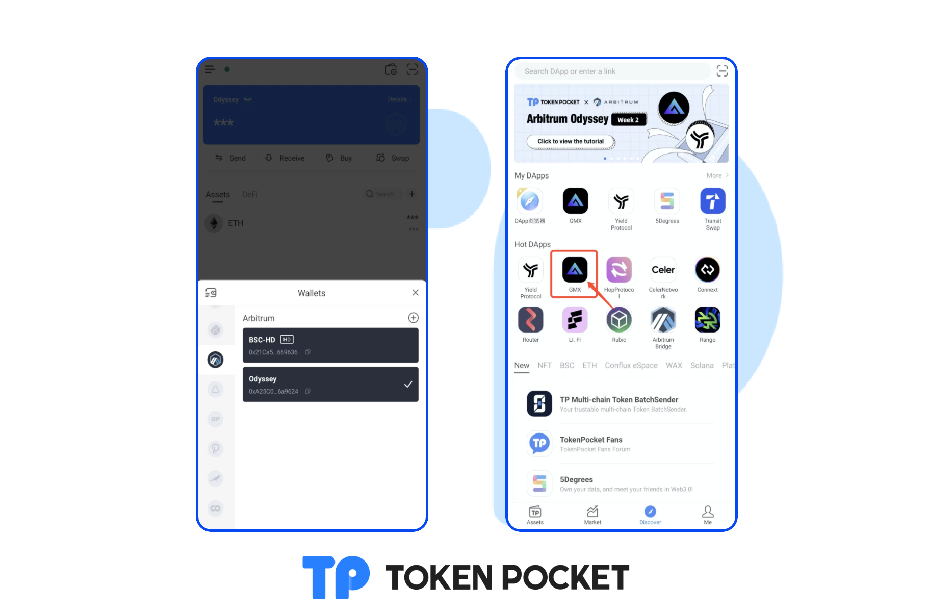 Open TokenPocket, select the Arbitrum network, switch to the [Discover] page, and choose GMX. Or you can enter “https://gmx.financial/trade” on the search bar.