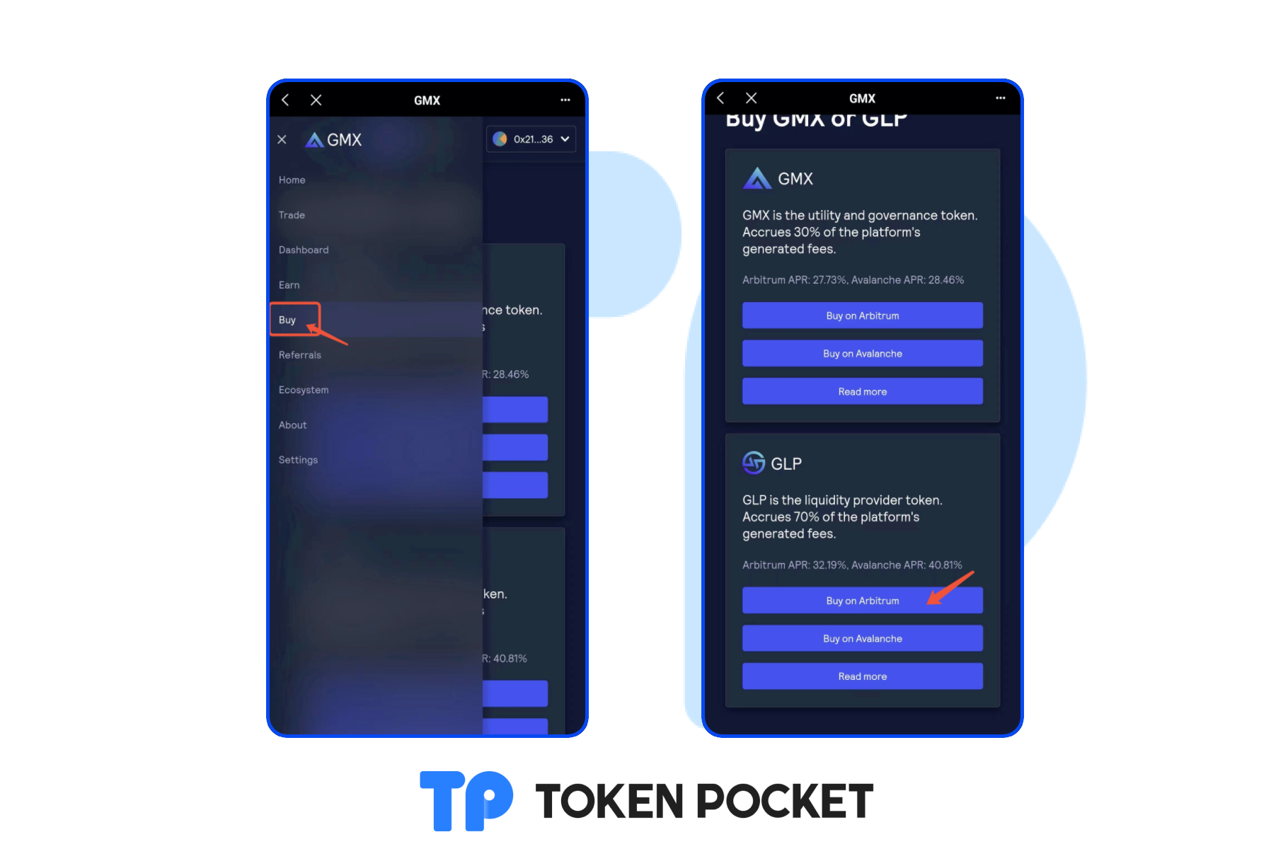 Click the button on the upper left corner and choose [Buy]. Select [Buy on Arbitrum].