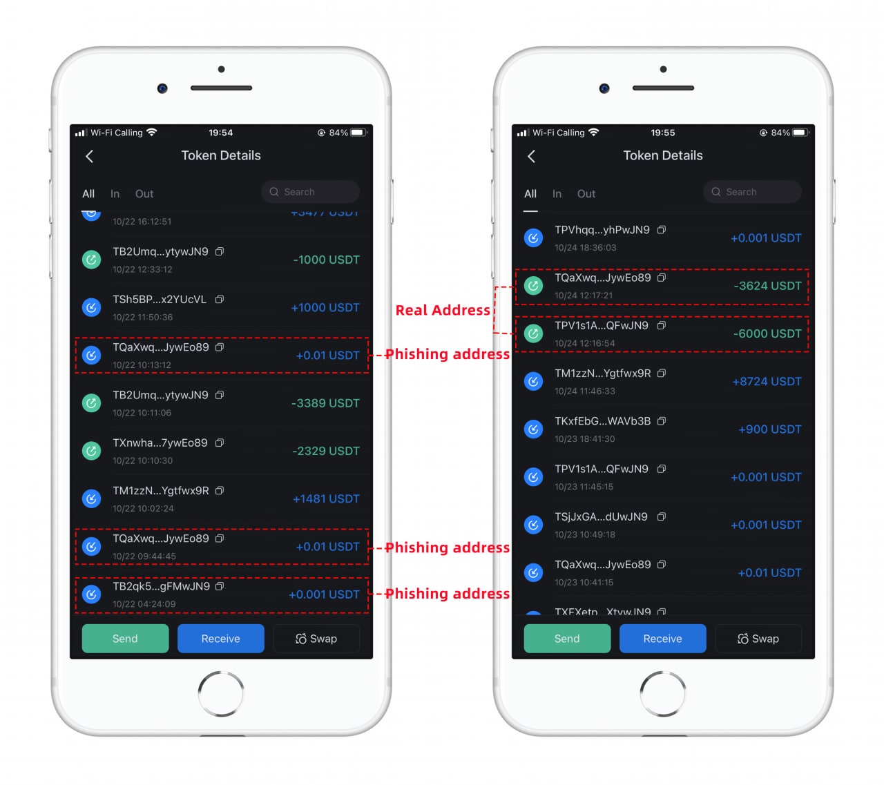 This scam is in a more "primitive" way, the scammers will monitor the addresses which usually transfer large amounts of $USDT on-chain, and find the recipient address within the transaction history. Then, the scammers will use a tool like “Account Generator” and generate a “phishing” address that is very similar to the recipient address (usually the first few digits or the last few digits are as same as the recipient address), then, they will use this “phishing” address to transfer 0.001 USDT or 0.01 USDT to the users’ addresses, then this transaction will appear on users’ transaction history. If the users didn’t recognize it and copy the “phishing” address from the transaction history and paste it to the transfer page and execute the transfer operation.