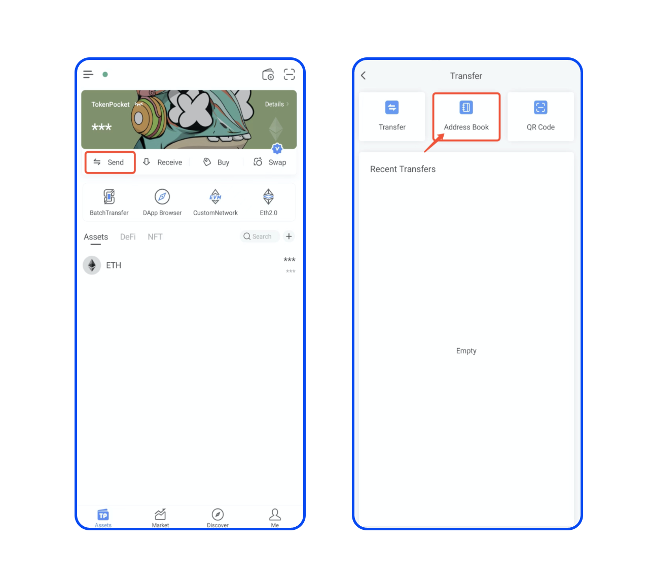 Please check the whole recipient address before you transfer, don’t copy the recipient address from the transaction history randomly! And we recommend you use the “Address Book” function on TokenPocket then you can directly choose the recipient address when you need to transfer.