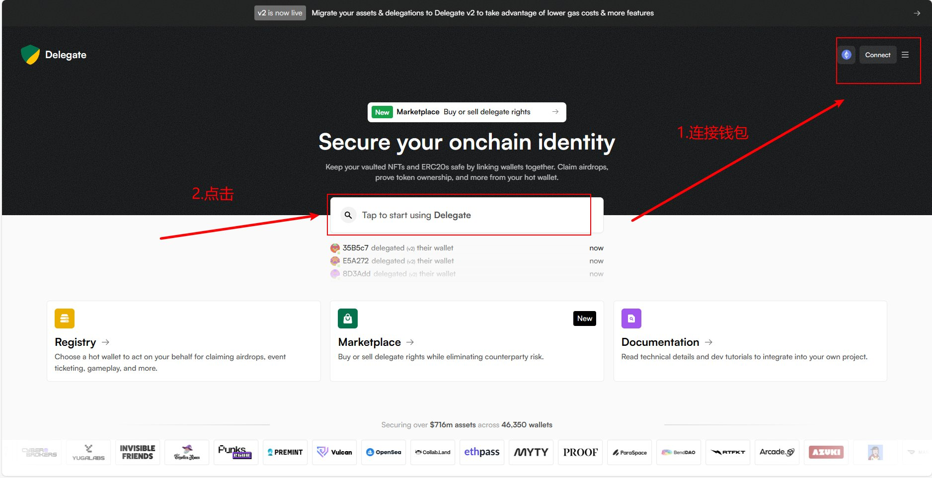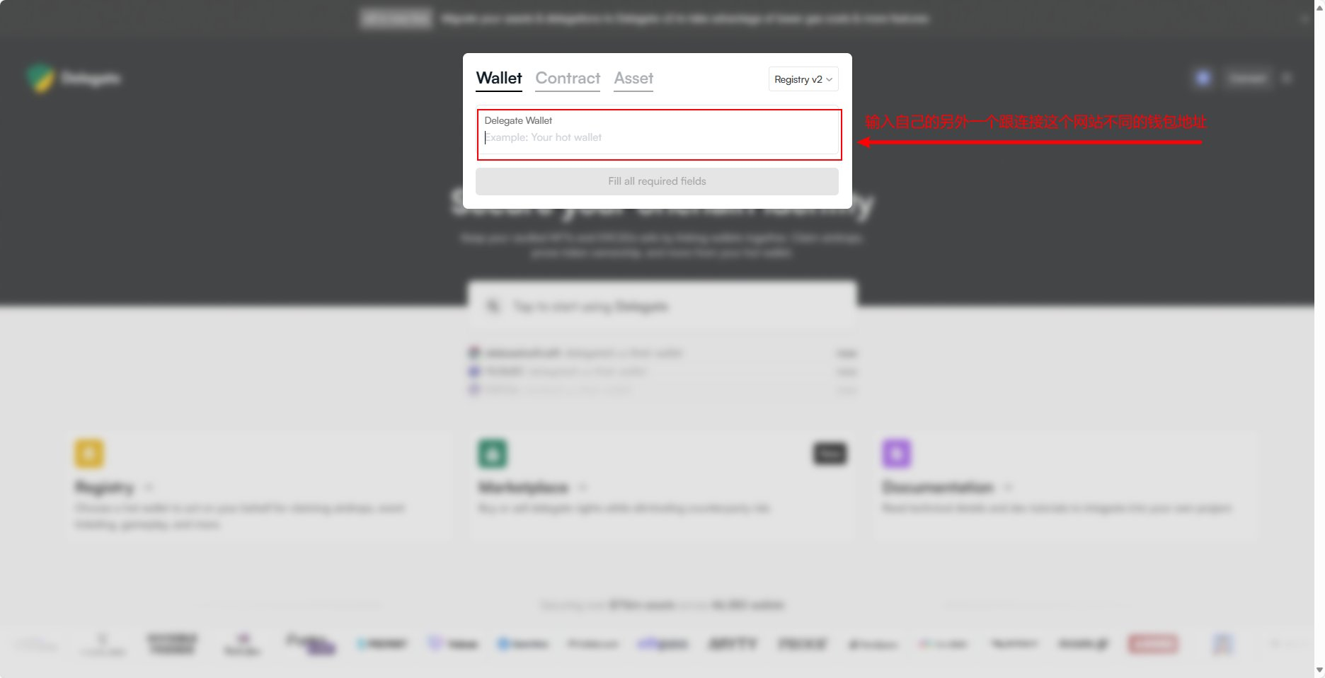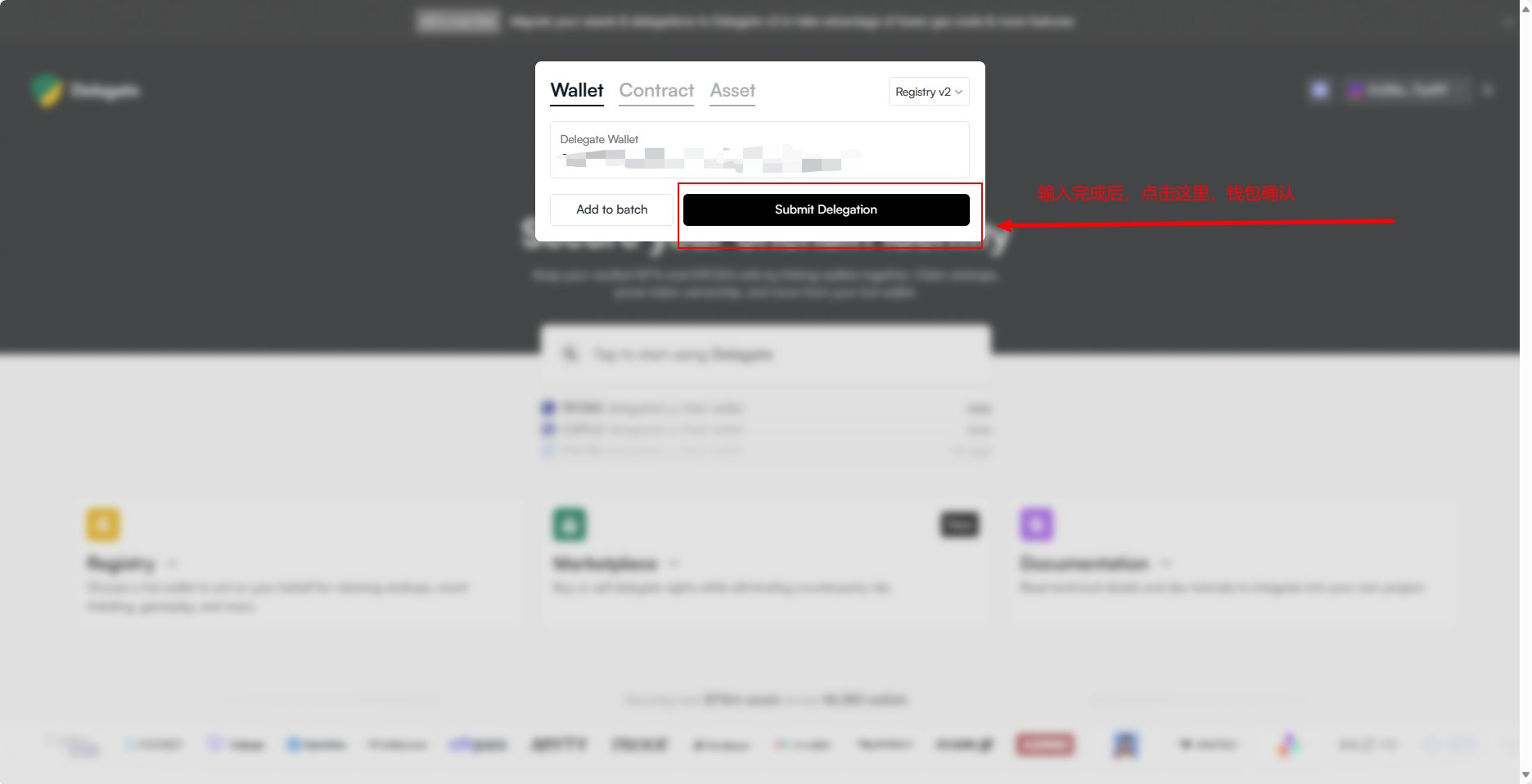 6.委托钱包 跟着图片操作,记得委托钱包要填与连接该网站不同的自己的钱包地址 链接:https://delegate.xyz