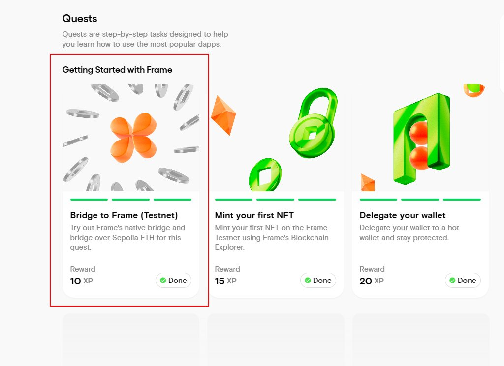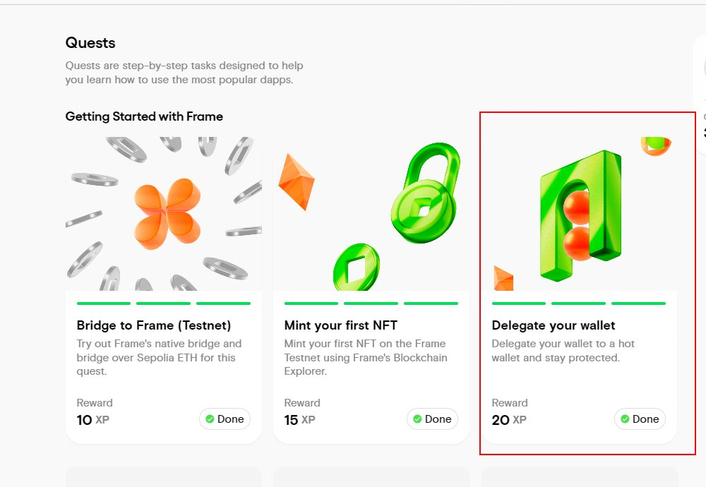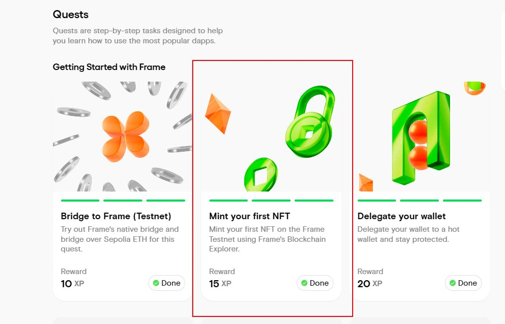 3.领取第一个NFT 点击左边的第一个任务 →点击Change network →钱包确认切换至Frame Testnet网络 →最后点击Claim badge领取NFT成功! 链接:https://frame.xyz/quests