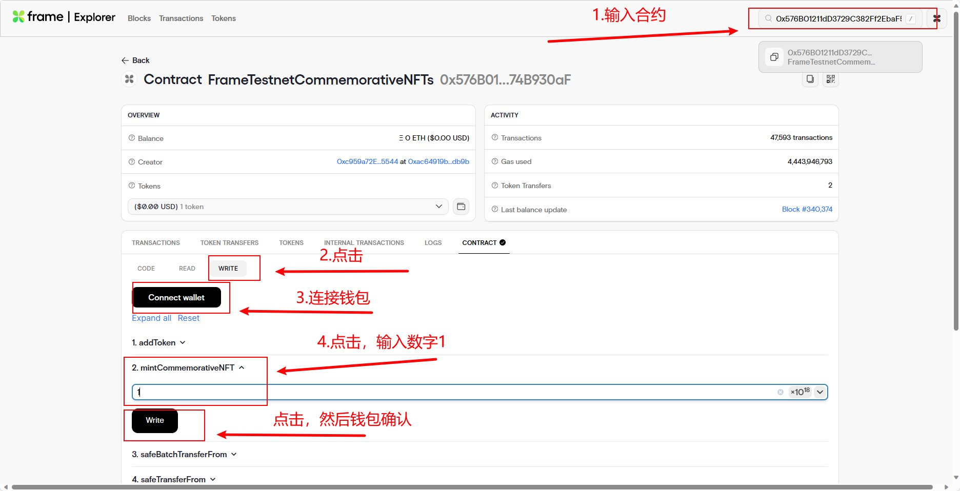 4.使用区块链浏览器铸造NFT 这步直接看图片操作。 合约地址:0x576B01211dD3729C382Ff2EbaF57ab6074B930aF